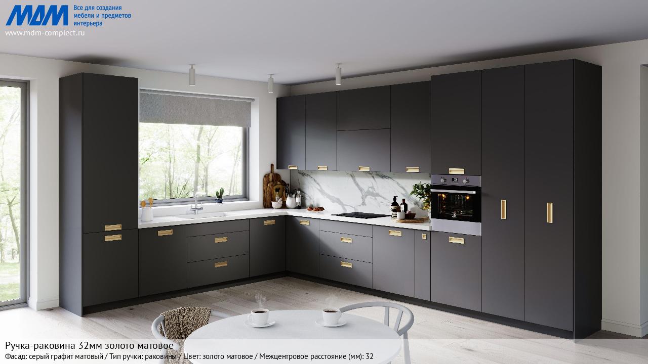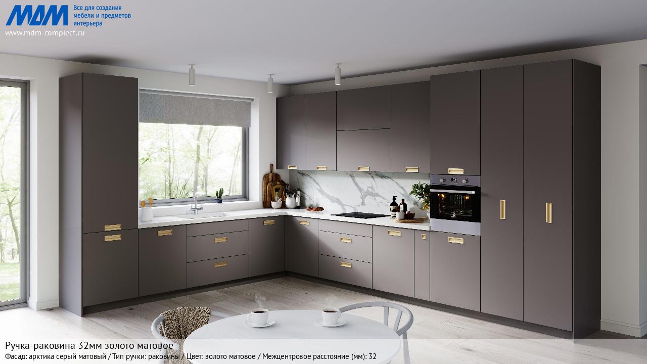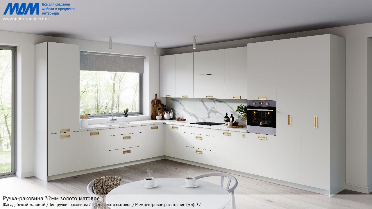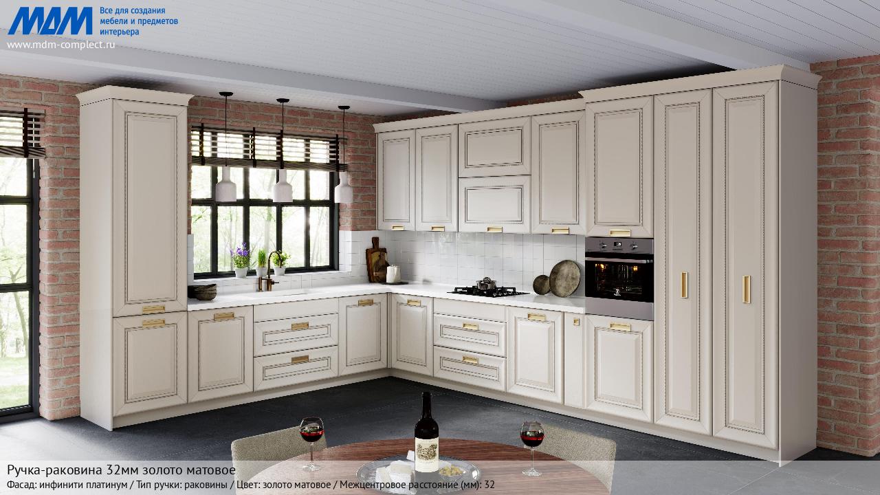 Мебельная Ручка-раковина 32мм золото матовое на различных фасадах в кухонном интерьере в стиле классика, лофт, модерн.