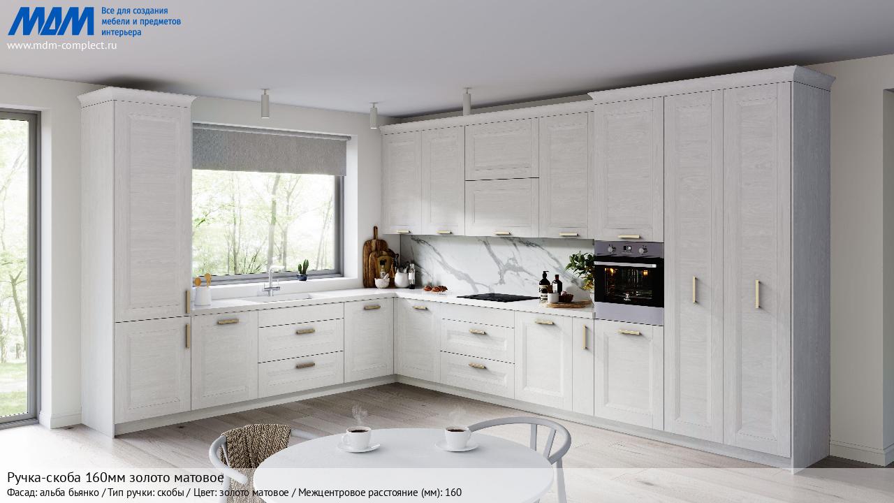Мебельная Ручка-скоба 160мм золото матовое на различных фасадах в кухонном интерьере в стиле классика, лофт, модерн.