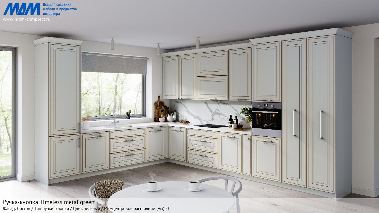 Мебельная Ручка-кнопка Timeless metal green на различных фасадах в кухонном интерьере в стиле классика, лофт, модерн.