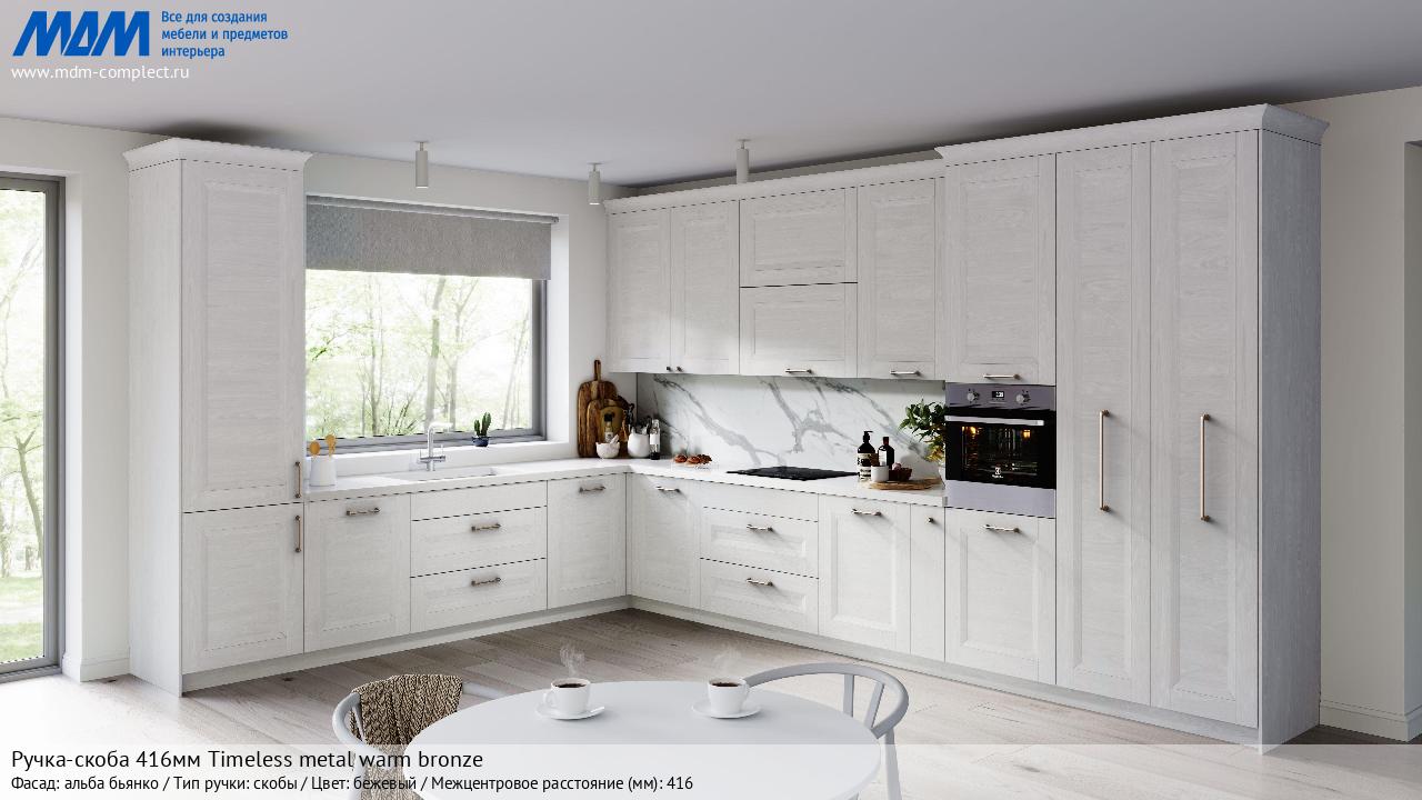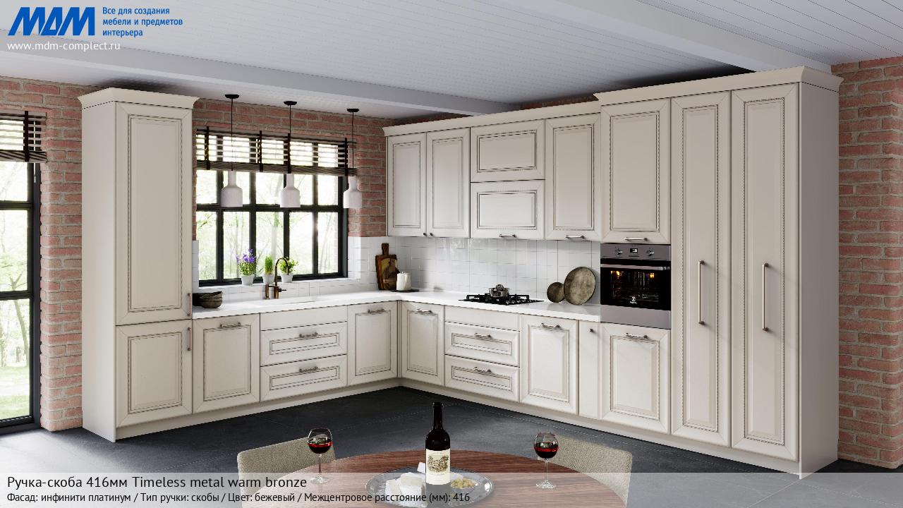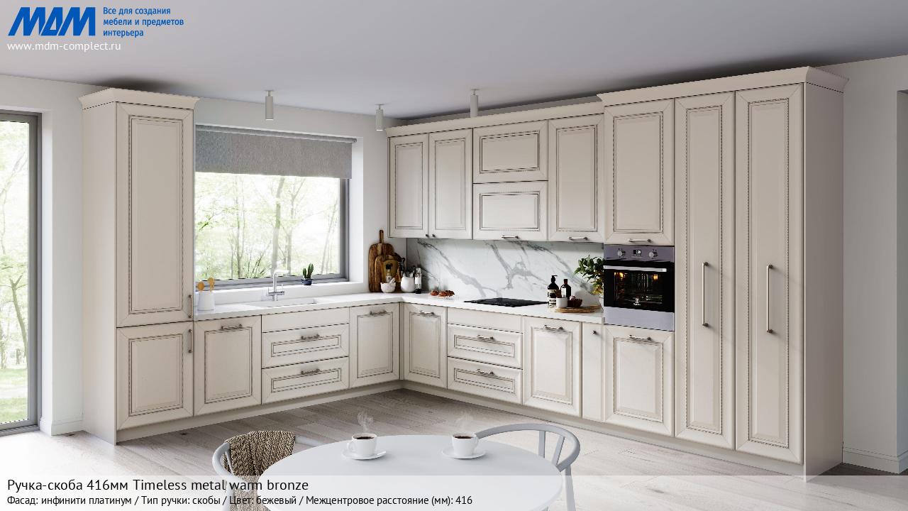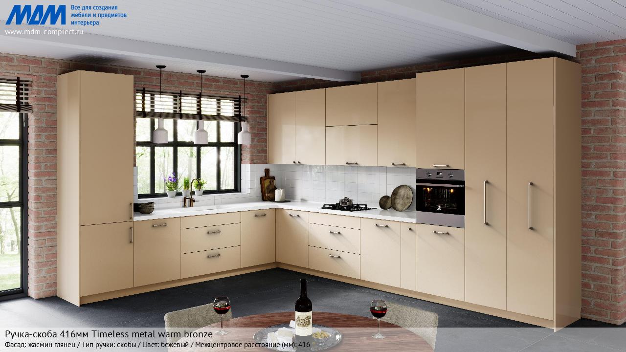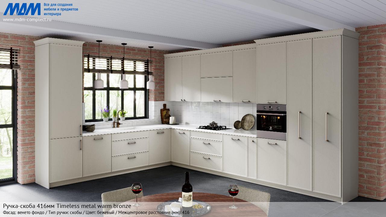 Мебельная Ручка-скоба 416мм Timeless metal warm bronze на различных фасадах в кухонном интерьере в стиле классика, лофт, модерн.