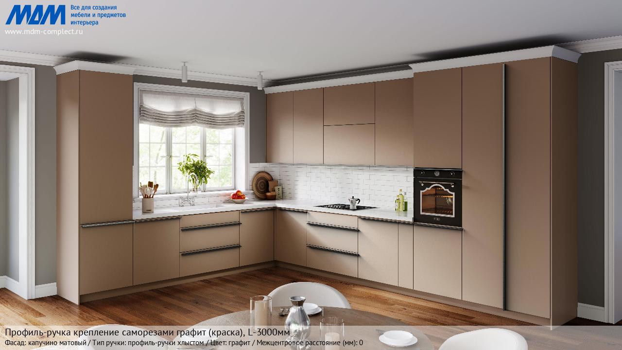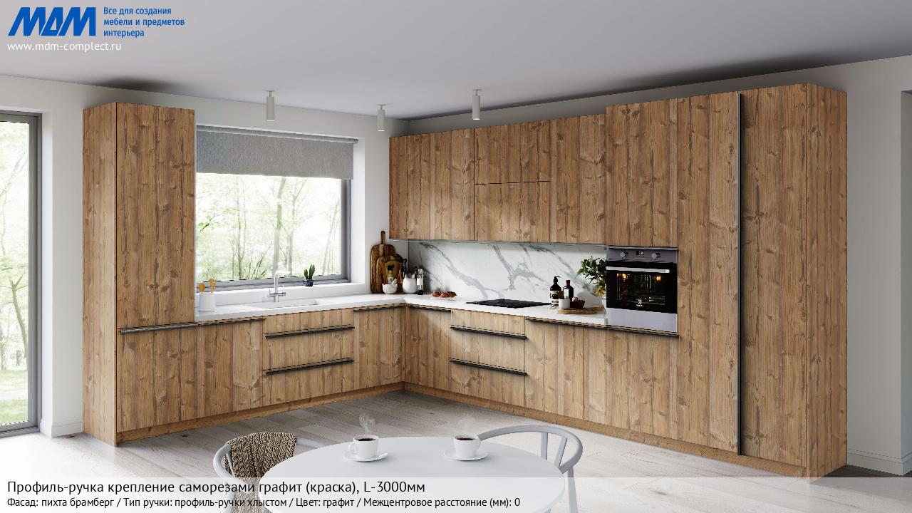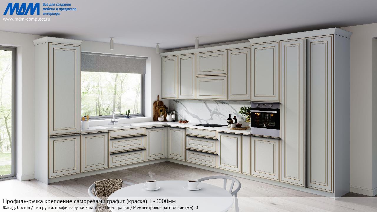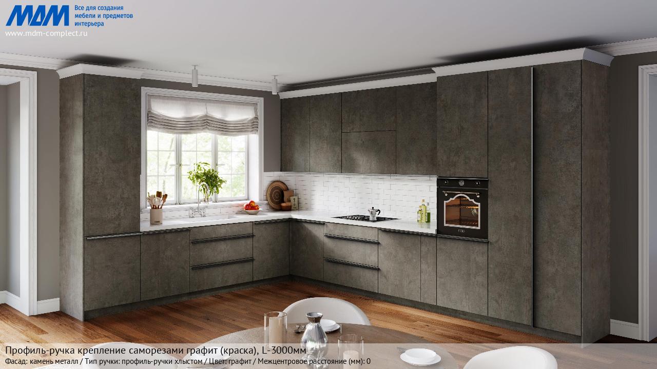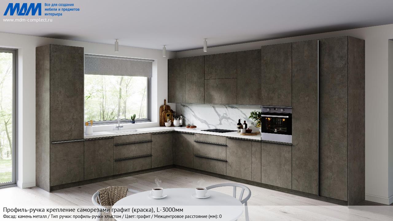 Мебельная Профиль-ручка крепление саморезами графит (краска), L-3000мм на различных фасадах в кухонном интерьере в стиле классика, лофт, модерн.