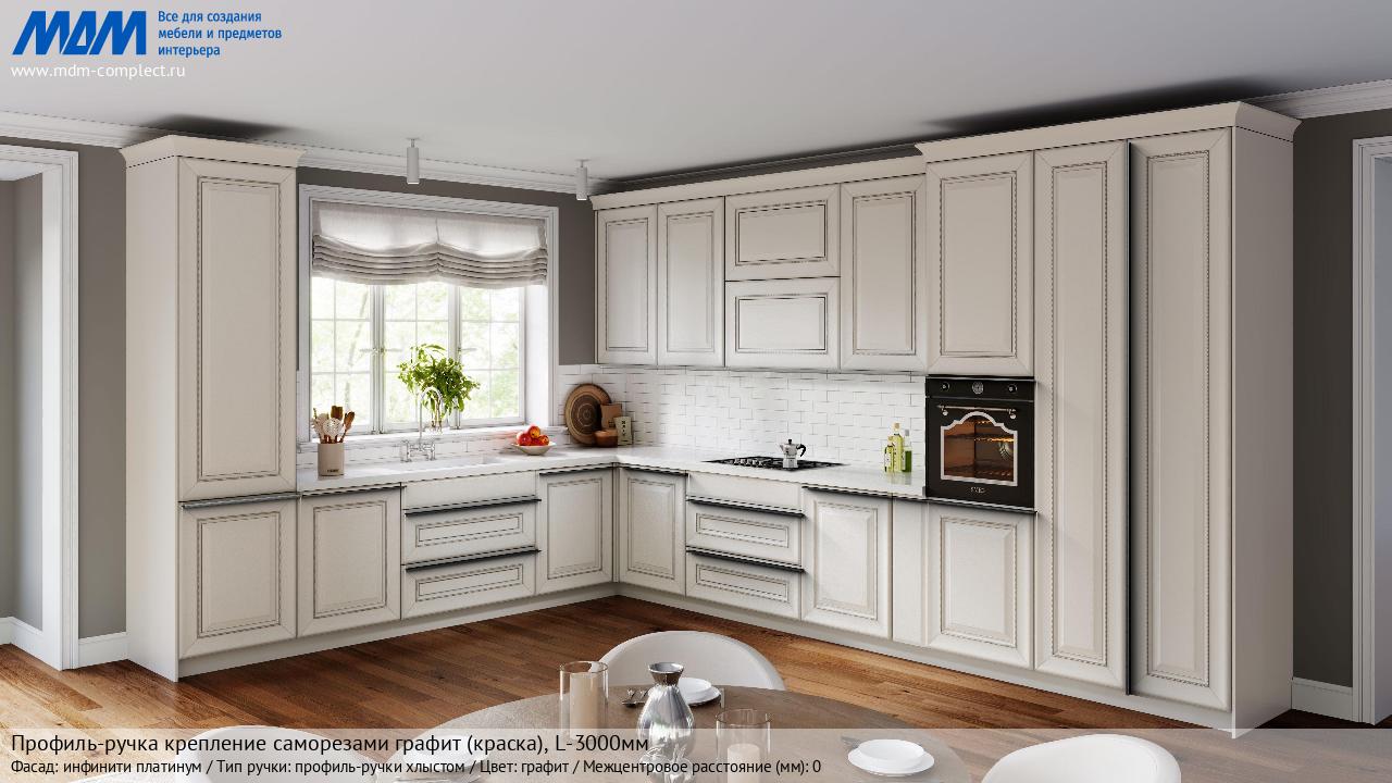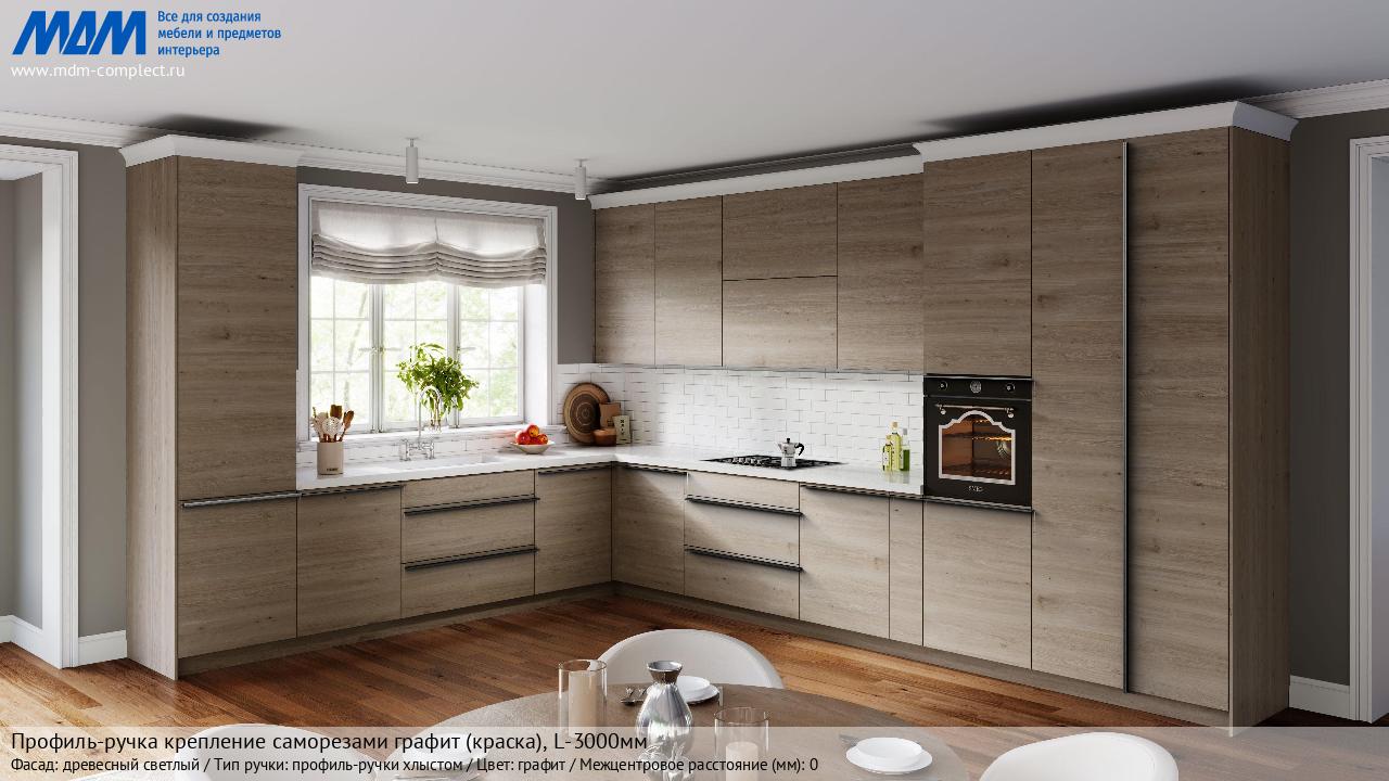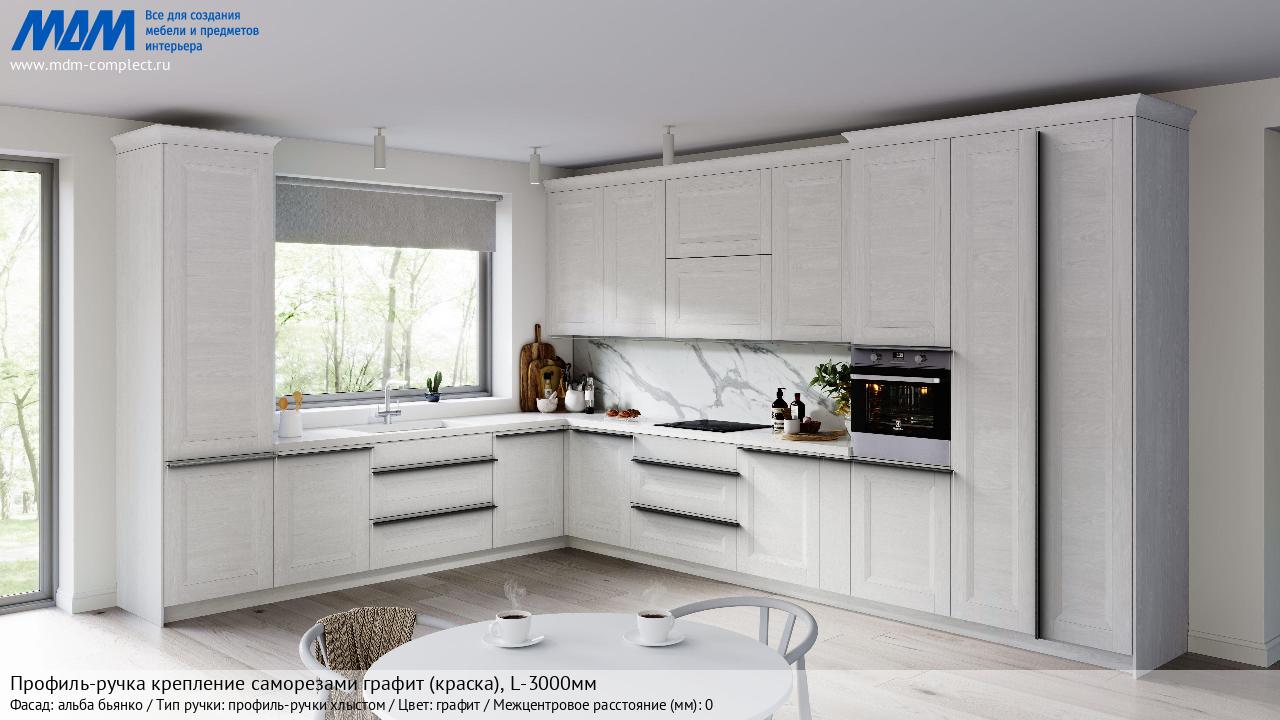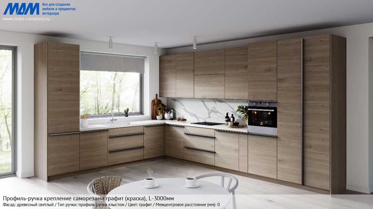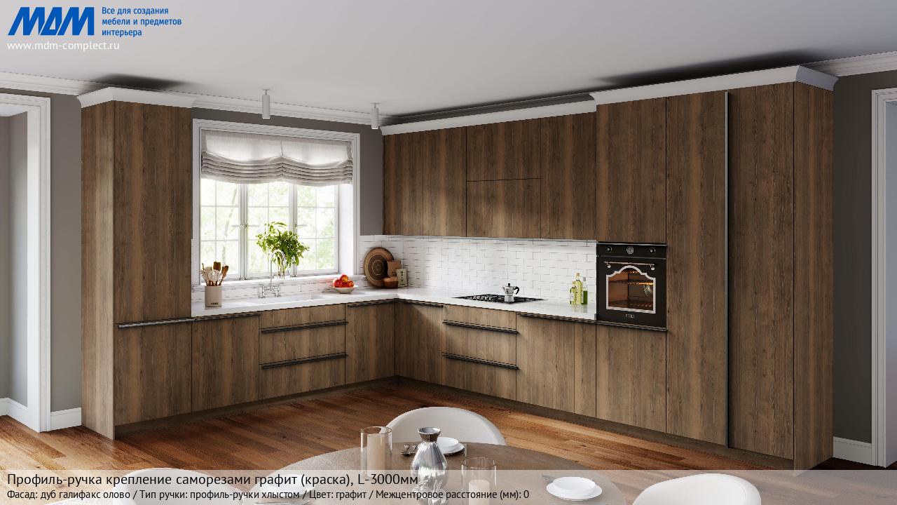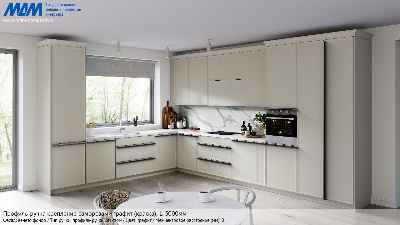 Мебельная Профиль-ручка крепление саморезами графит (краска), L-3000мм на различных фасадах в кухонном интерьере в стиле классика, лофт, модерн.