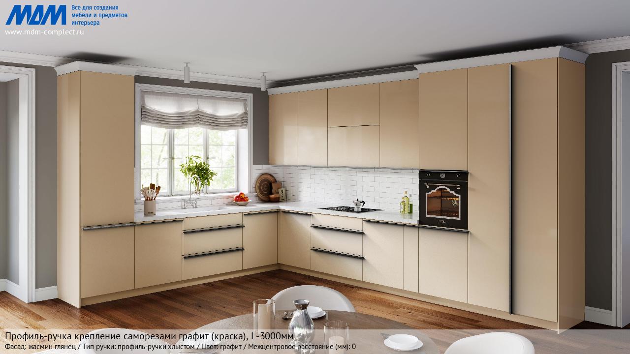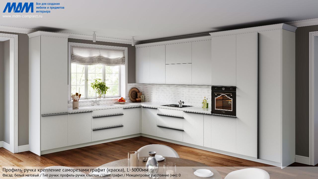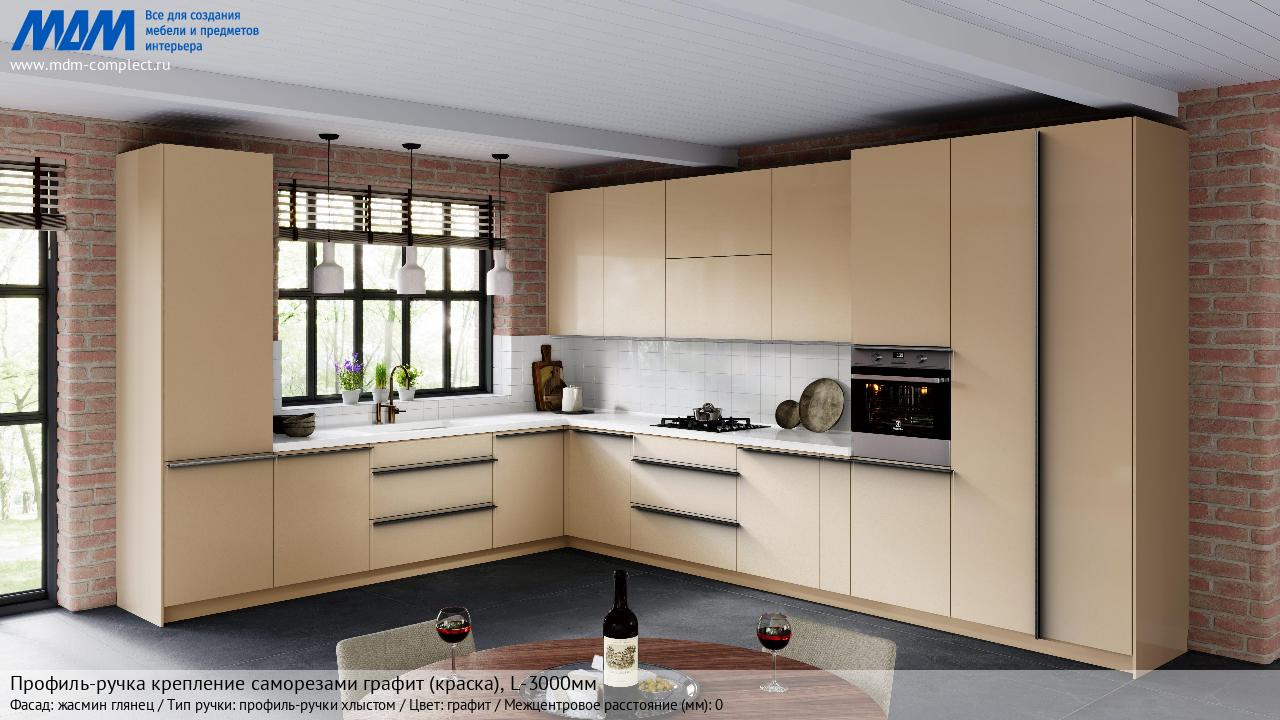 Профиль-ручка крепление саморезами графит (краска), L-3000мм (PH.RU03.3000.9712 PR) в готовой кухне на различных фасадах