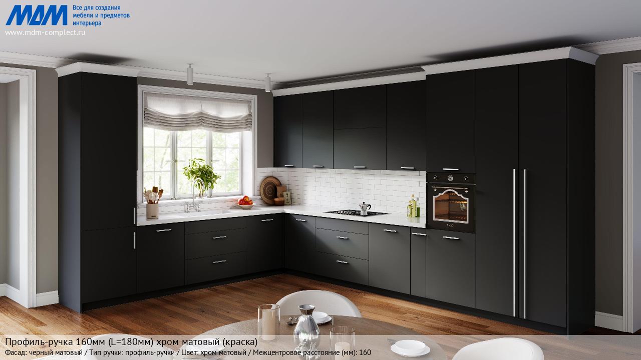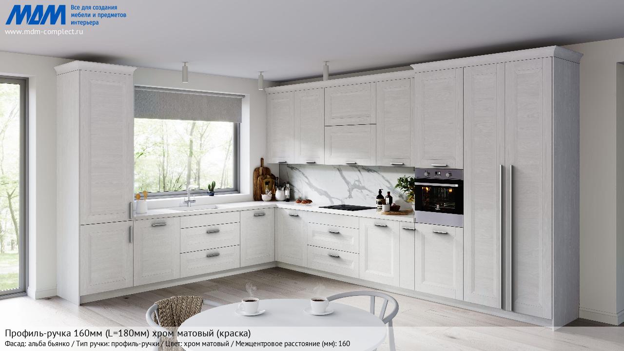 Мебельная Профиль-ручка 160мм (L=180мм) хром матовый (краска) на различных фасадах в кухонном интерьере в стиле классика, лофт, модерн.