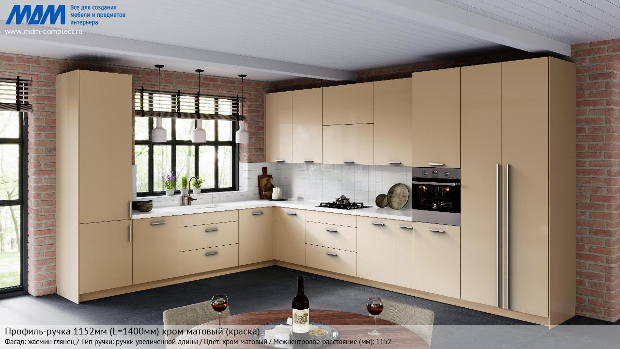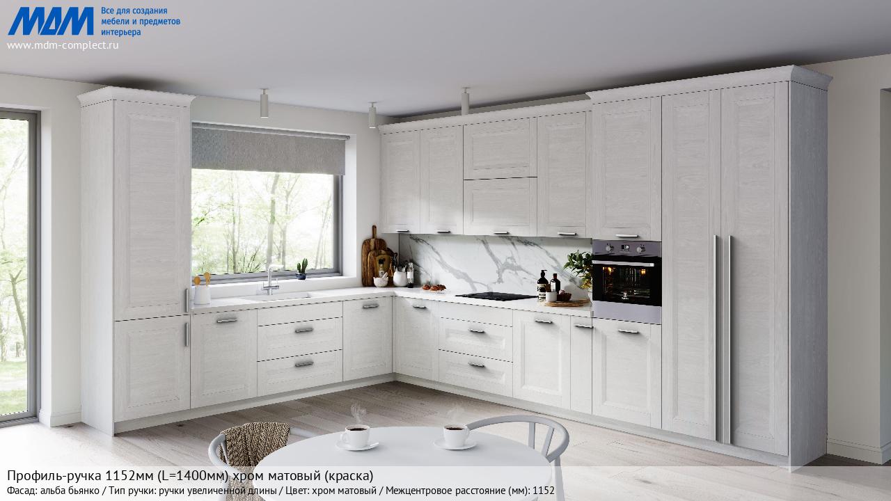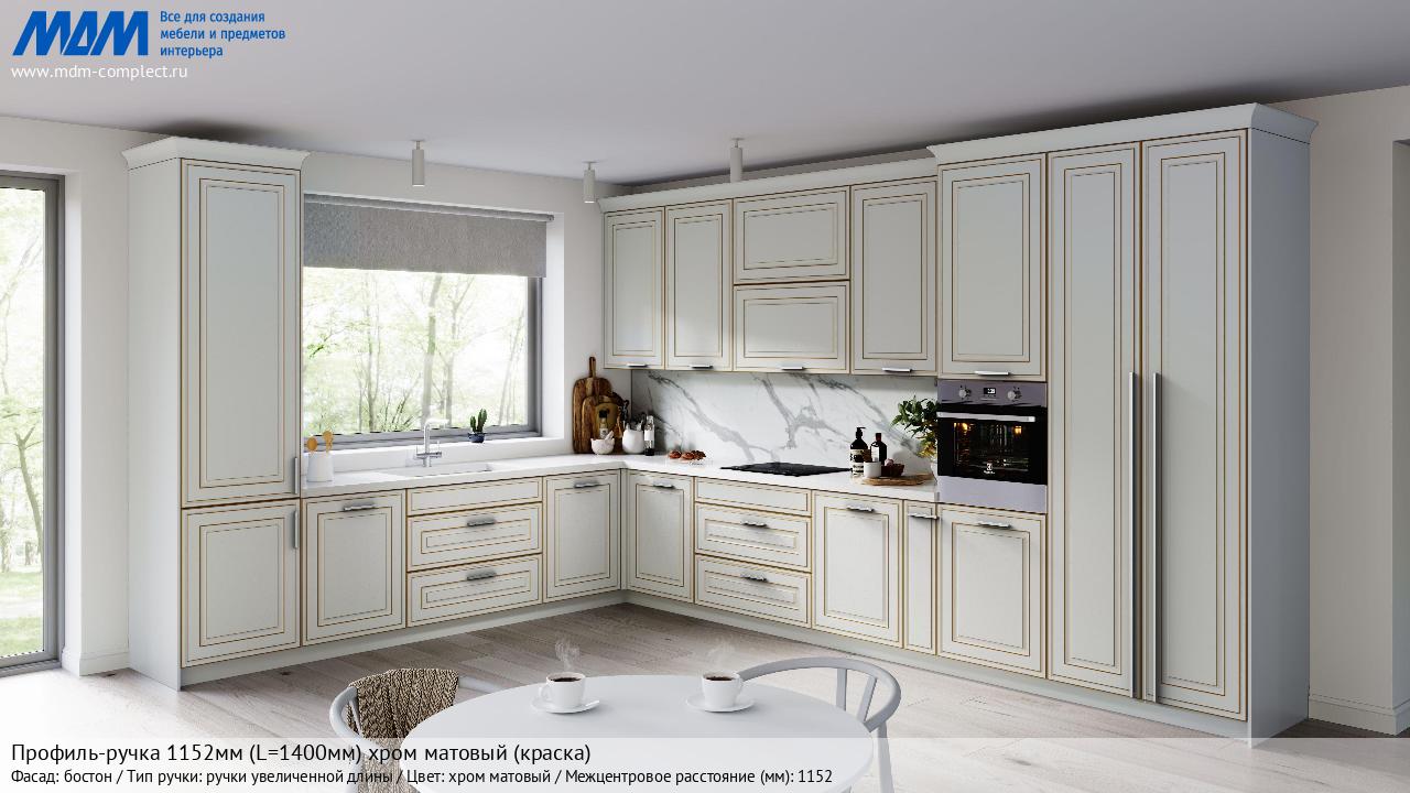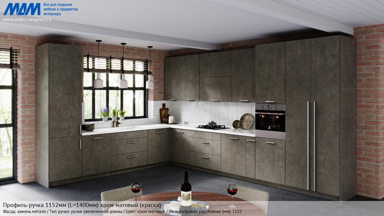 Мебельная Профиль-ручка 1152мм (L=1400мм) хром матовый (краска) на различных фасадах в кухонном интерьере в стиле классика, лофт, модерн.
