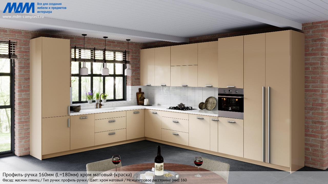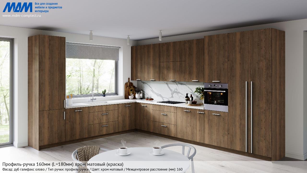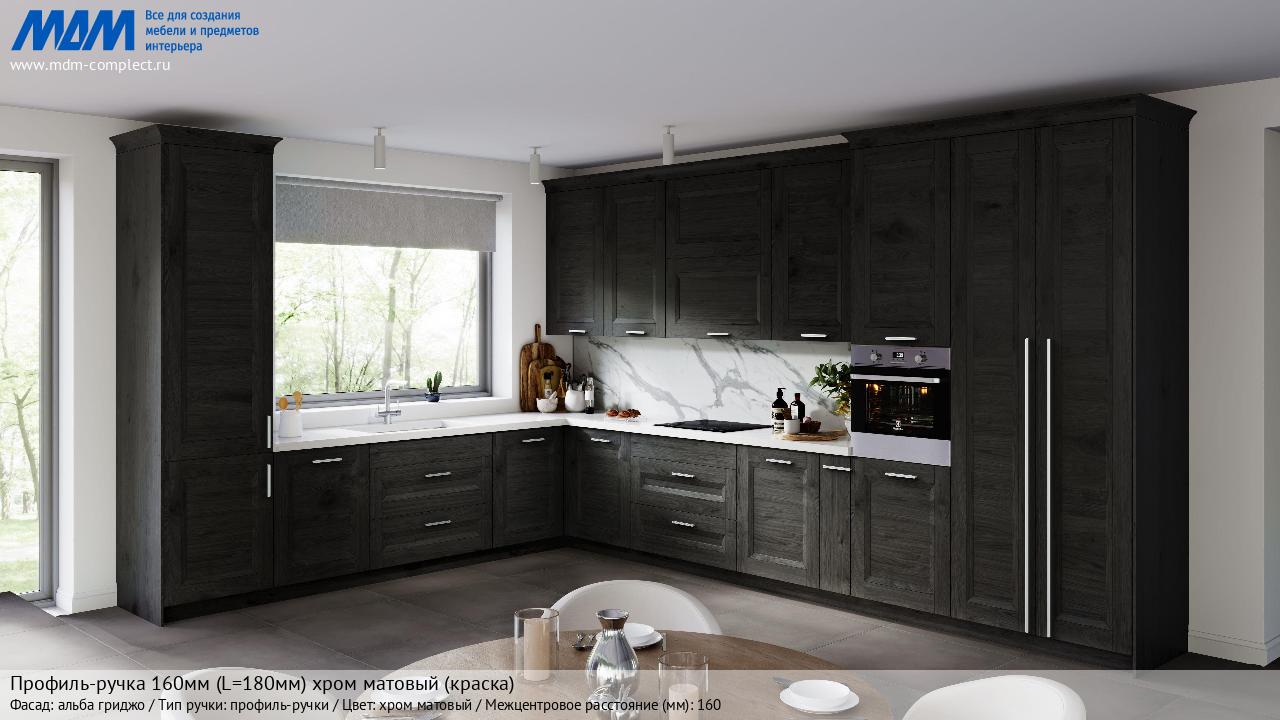 Профиль-ручка 160мм (L=180мм) хром матовый (краска) (PH.RU32.180.CRM) в готовой кухне на различных фасадах