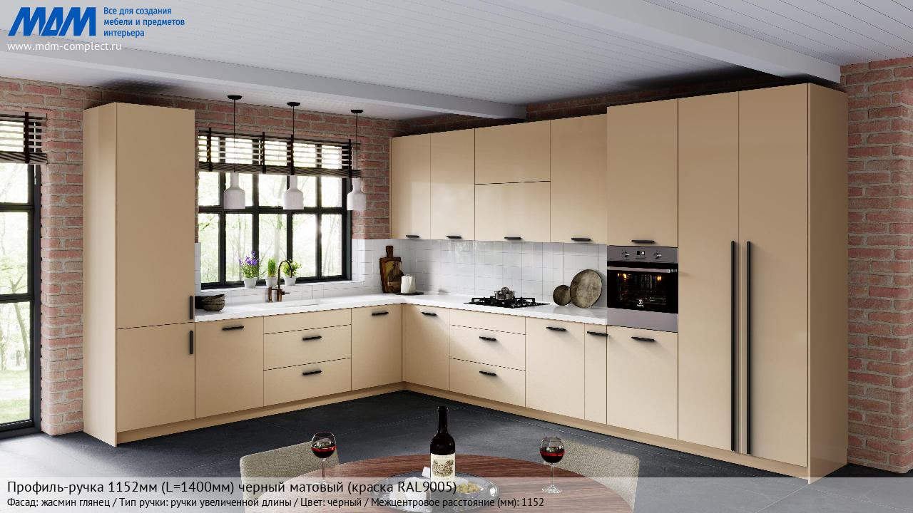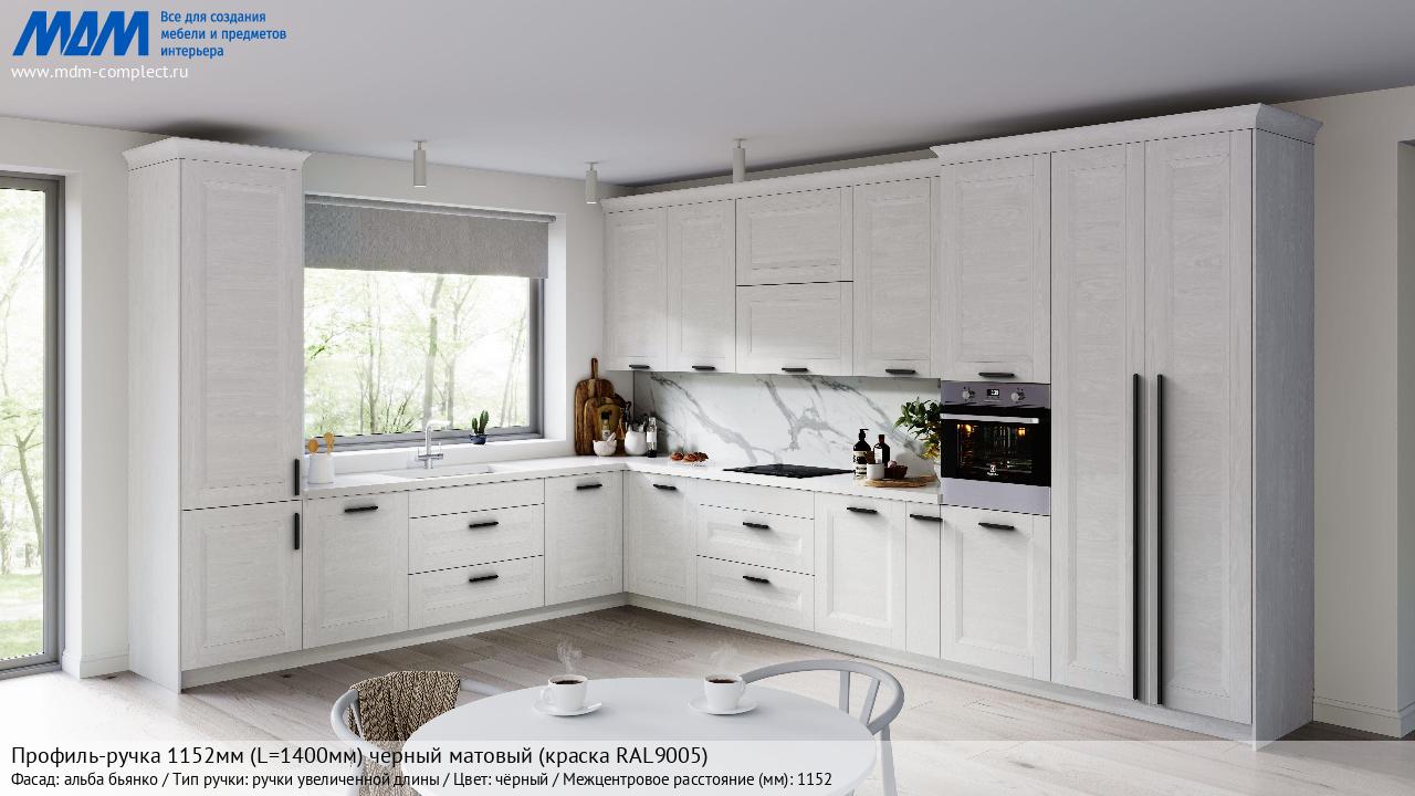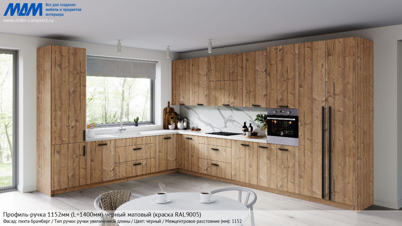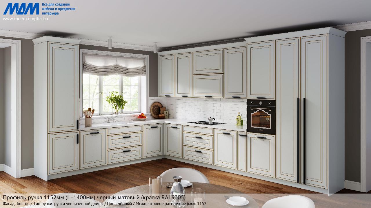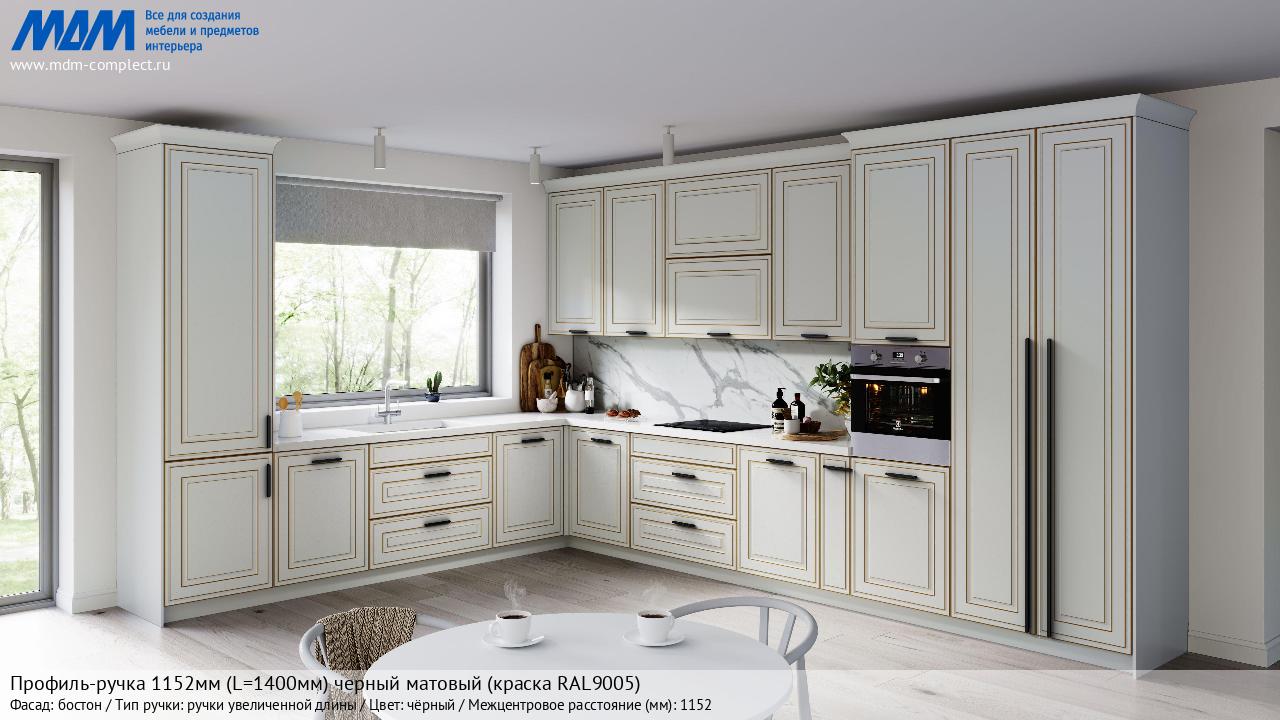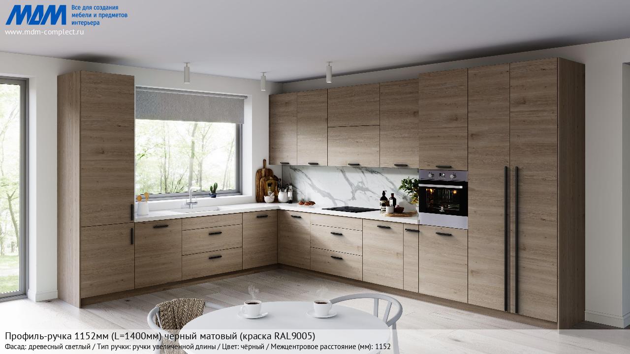 Мебельная Профиль-ручка 1152мм (L=1400мм) черный матовый (краска RAL9005) на различных фасадах в кухонном интерьере в стиле классика, лофт, модерн.
