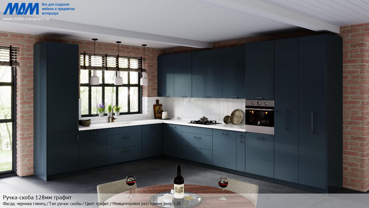 Мебельная Ручка-скоба 128мм графит на различных фасадах в кухонном интерьере в стиле классика, лофт, модерн.