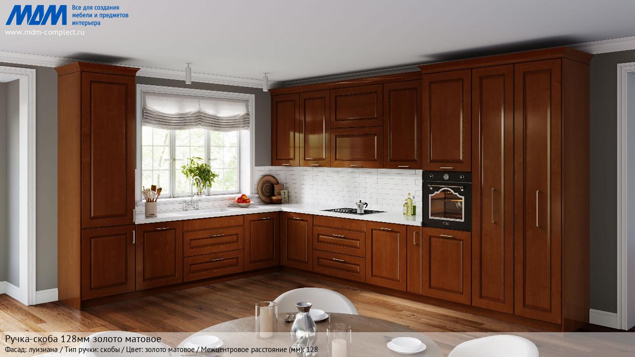 Мебельная Ручка-скоба 128мм золото матовое на различных фасадах в кухонном интерьере в стиле классика, лофт, модерн.