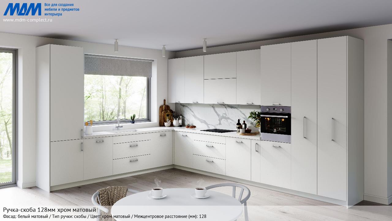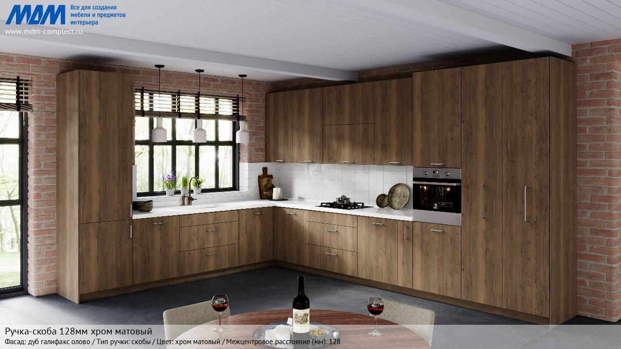 Мебельная Ручка-скоба 128мм хром матовый на различных фасадах в кухонном интерьере в стиле классика, лофт, модерн.