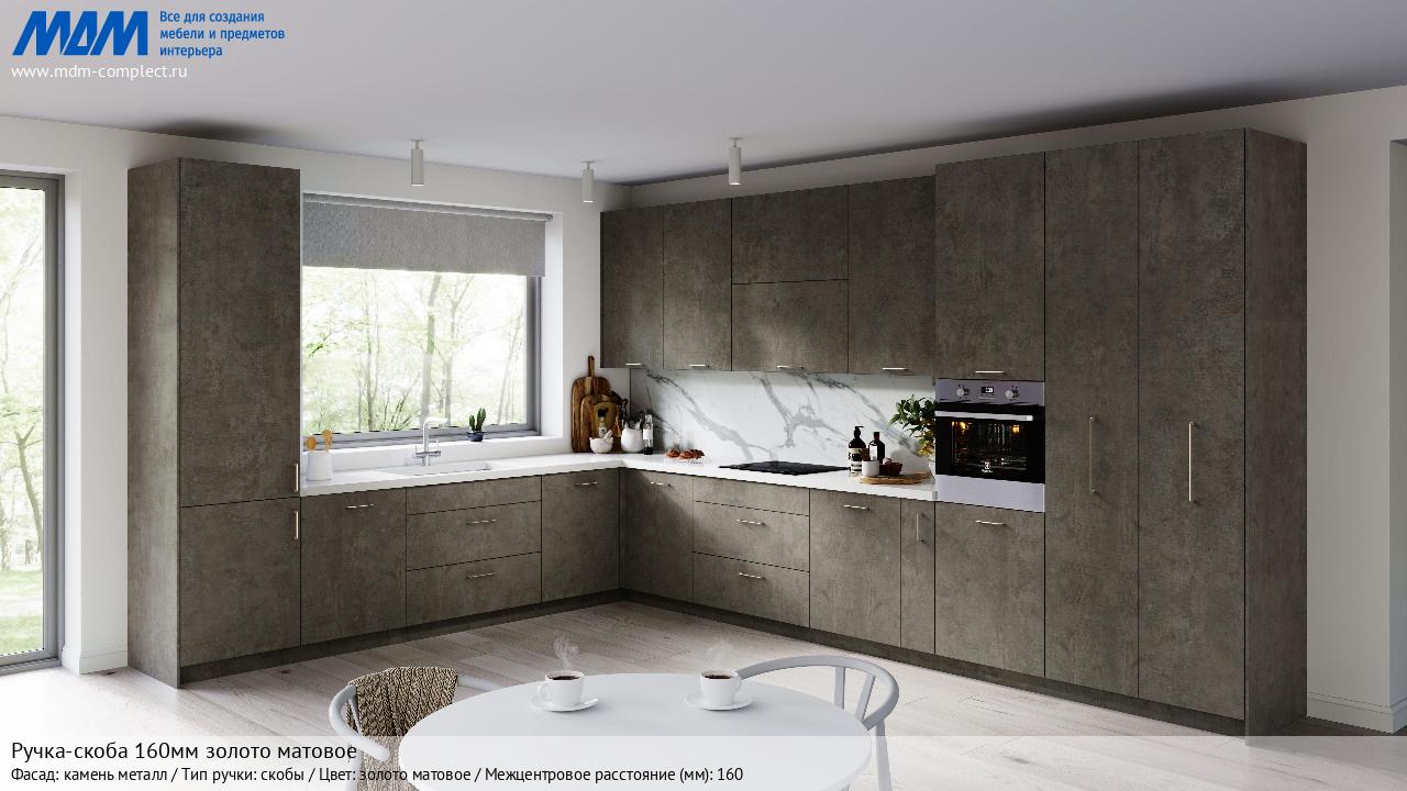 Мебельная Ручка-скоба 160мм золото матовое на различных фасадах в кухонном интерьере в стиле классика, лофт, модерн.