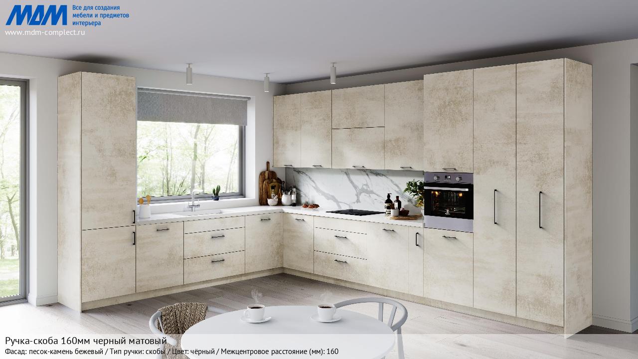 Мебельная Ручка-скоба 160мм черный матовый на различных фасадах в кухонном интерьере в стиле классика, лофт, модерн.