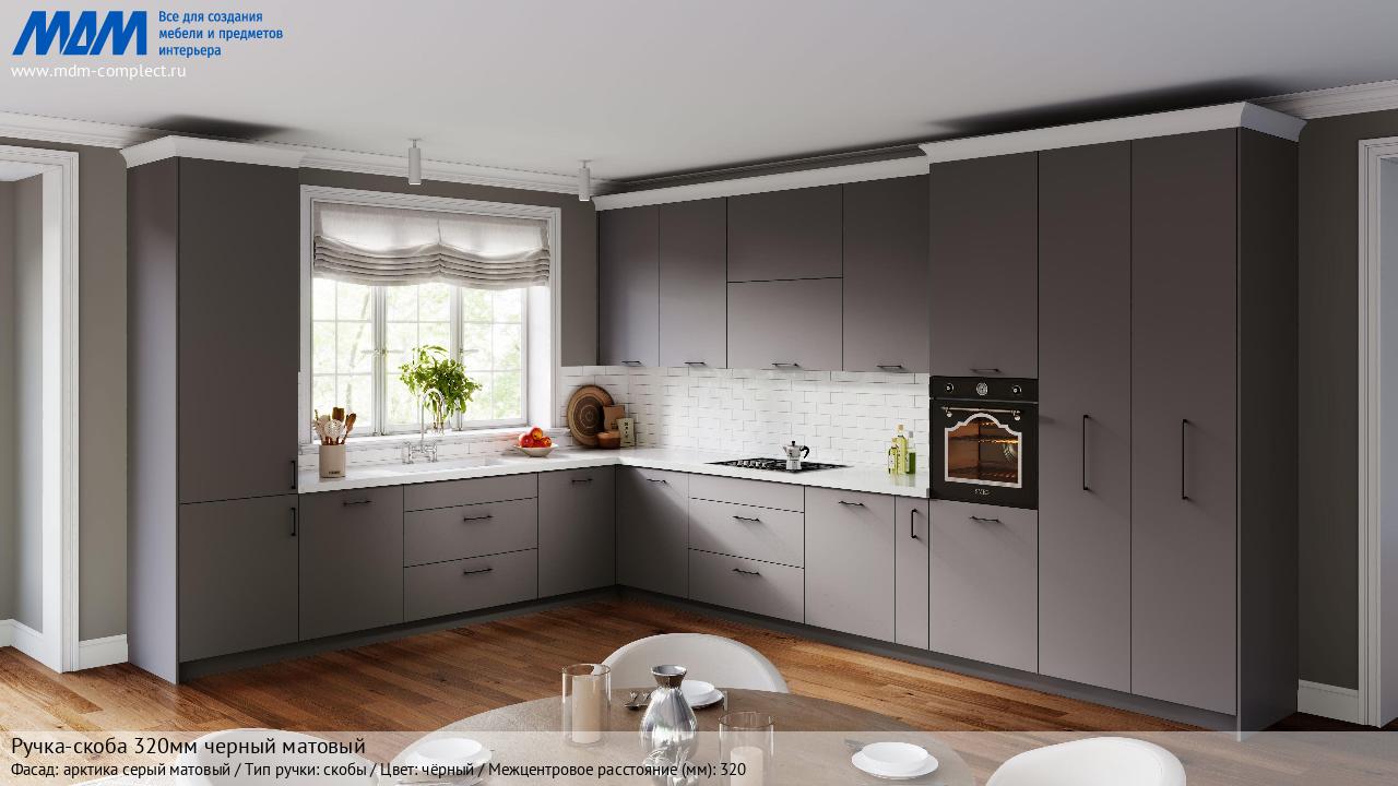 Мебельная Ручка-скоба 320мм черный матовый на различных фасадах в кухонном интерьере в стиле классика, лофт, модерн.