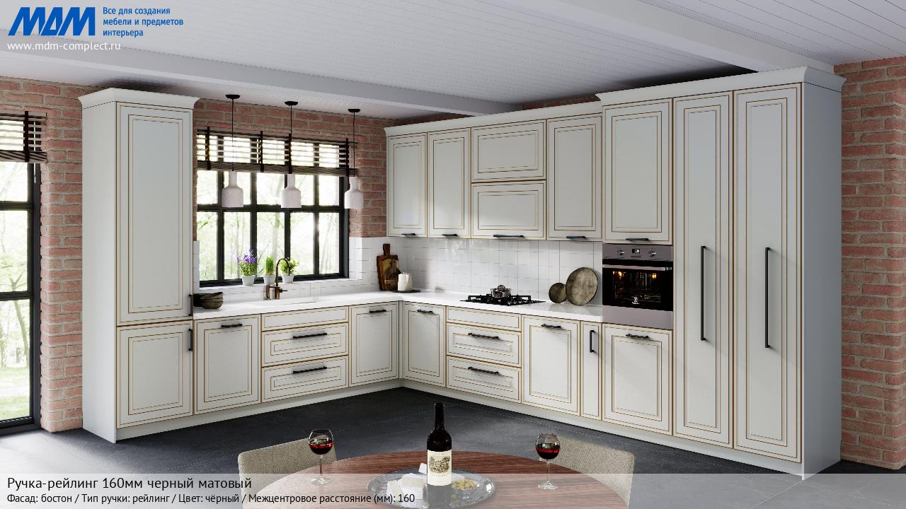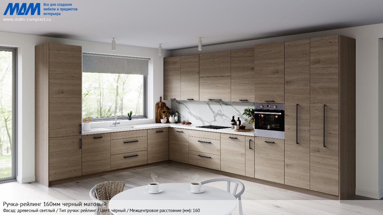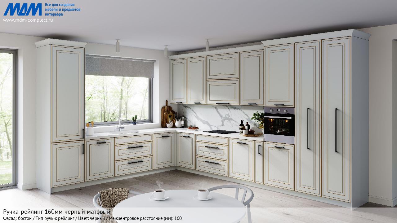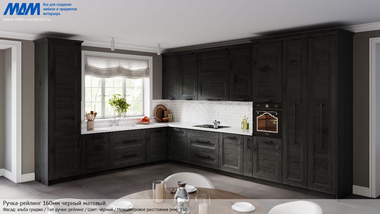 Мебельная Ручка-рейлинг 160мм черный матовый на различных фасадах в кухонном интерьере в стиле классика, лофт, модерн.