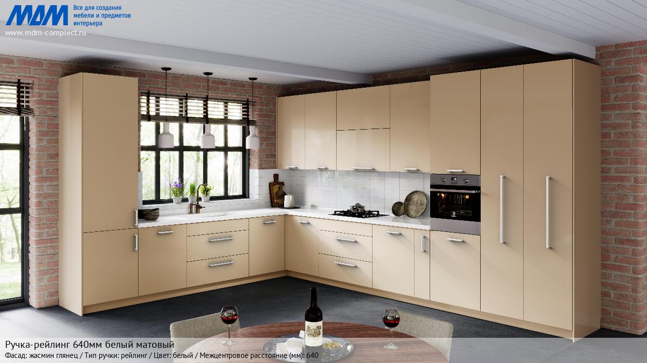 Мебельная Ручка-рейлинг 640мм белый матовый на различных фасадах в кухонном интерьере в стиле классика, лофт, модерн.