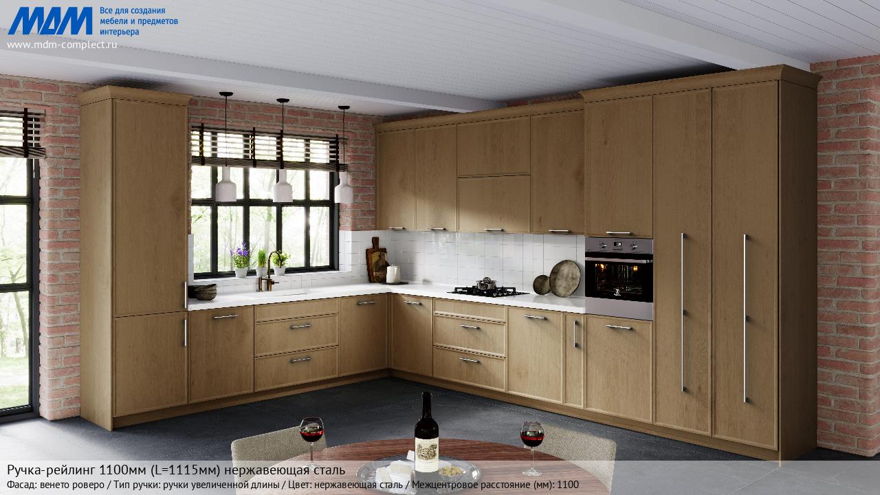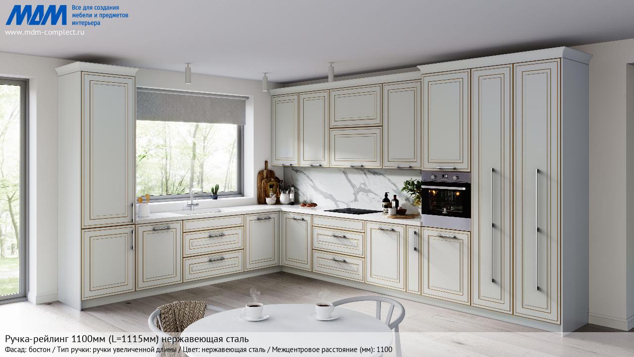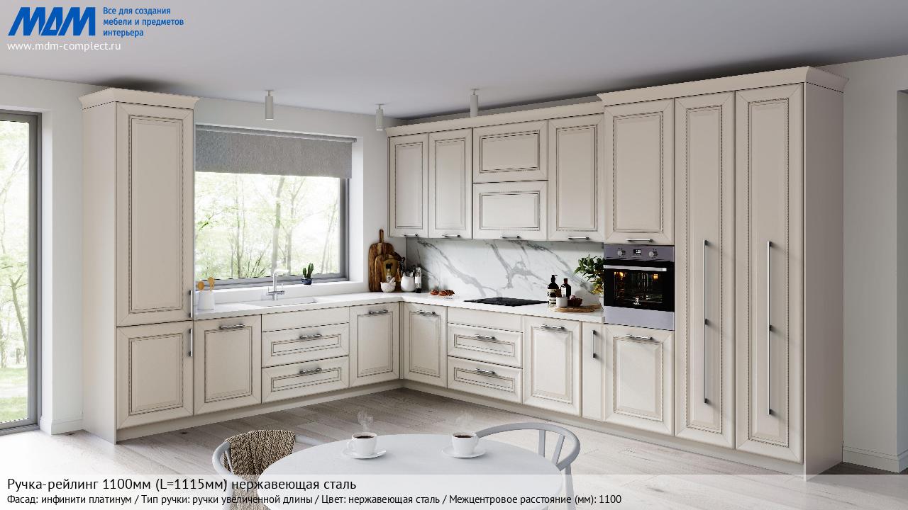 Мебельная Ручка-рейлинг 1100мм (L=1115мм) нержавеющая сталь на различных фасадах в кухонном интерьере в стиле классика, лофт, модерн.