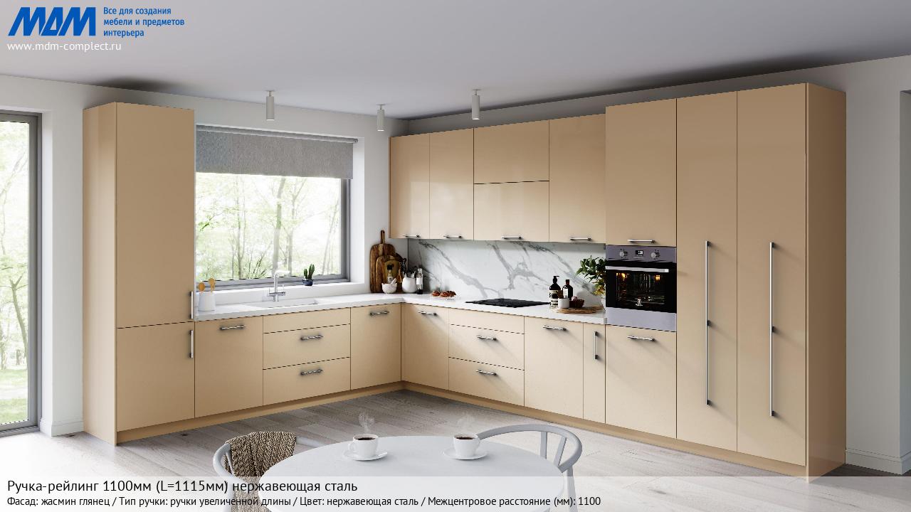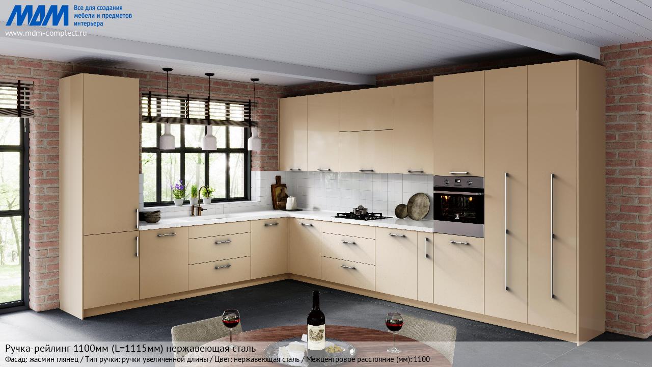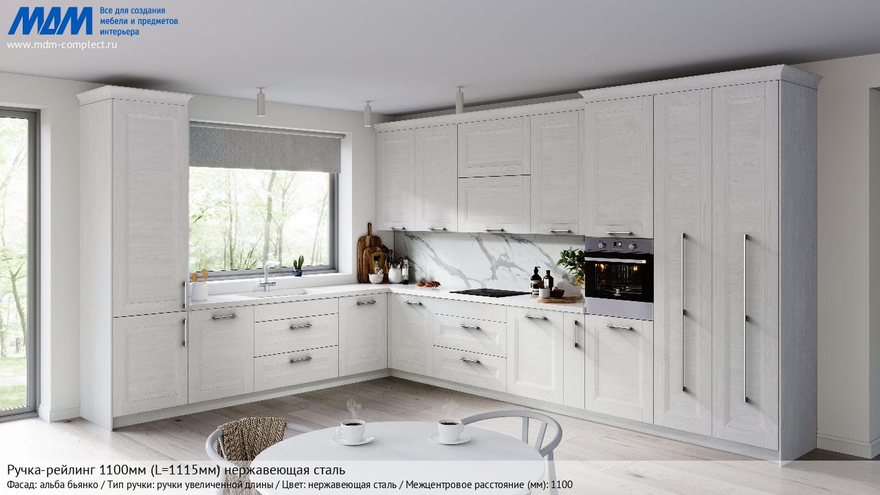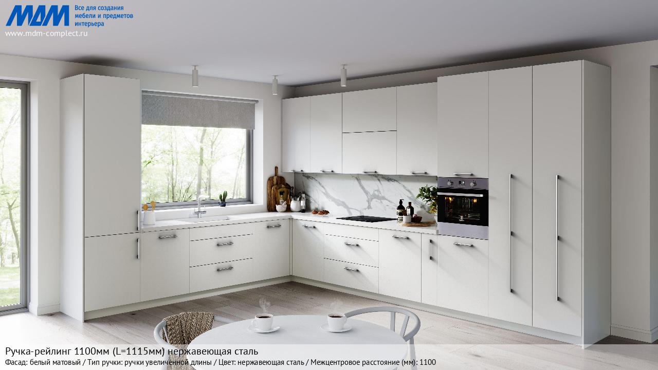 Мебельная Ручка-рейлинг 1100мм (L=1115мм) нержавеющая сталь на различных фасадах в кухонном интерьере в стиле классика, лофт, модерн.