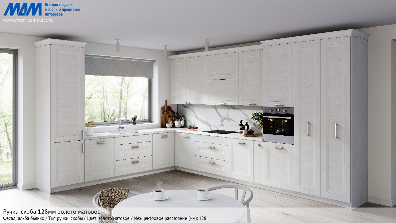 Мебельная Ручка-скоба 128мм золото матовое на различных фасадах в кухонном интерьере в стиле классика, лофт, модерн.