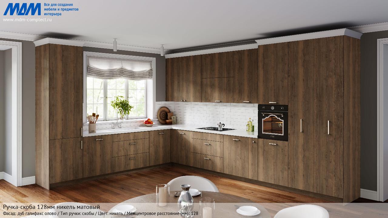Мебельная Ручка-скоба 128мм никель матовый на различных фасадах в кухонном интерьере в стиле классика, лофт, модерн.