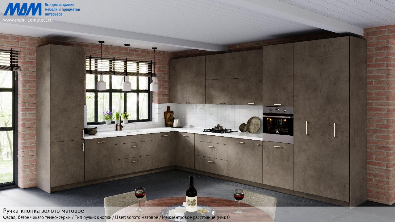 Мебельная Ручка-кнопка золото матовое на различных фасадах в кухонном интерьере в стиле классика, лофт, модерн.