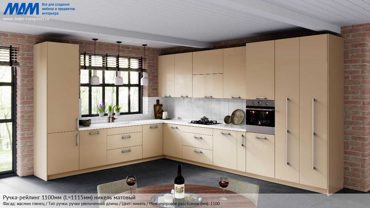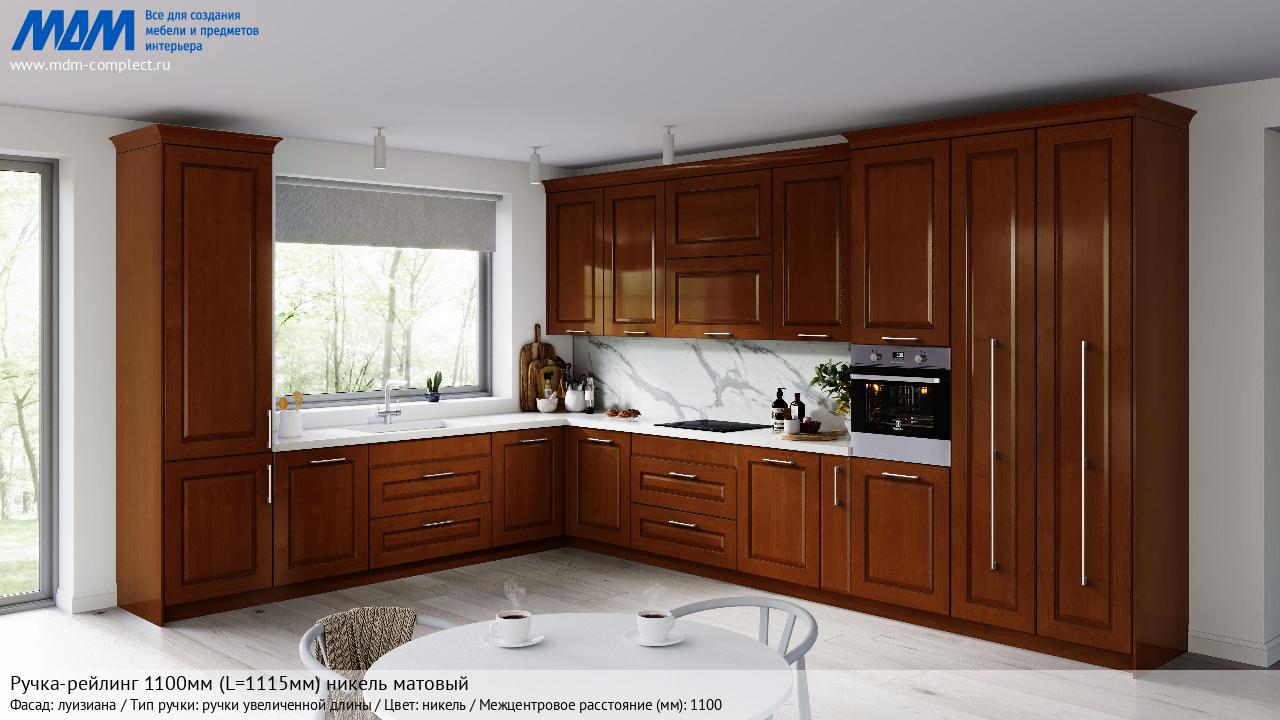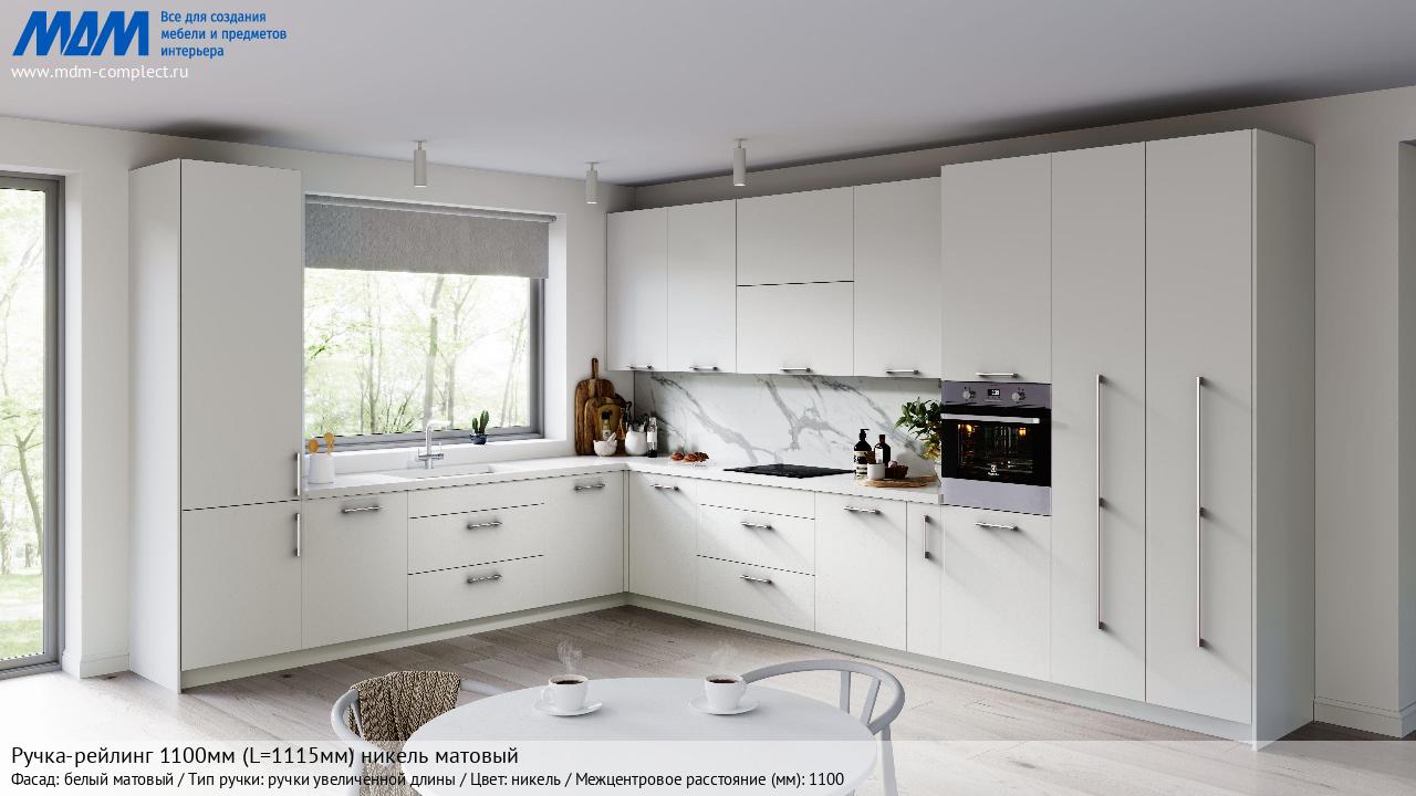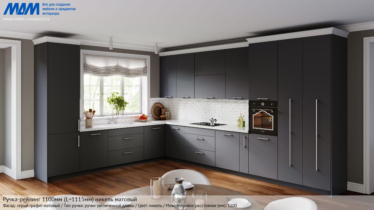 Мебельная Ручка-рейлинг 1100мм (L=1115мм) никель матовый на различных фасадах в кухонном интерьере в стиле классика, лофт, модерн.