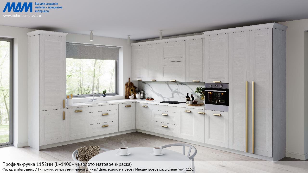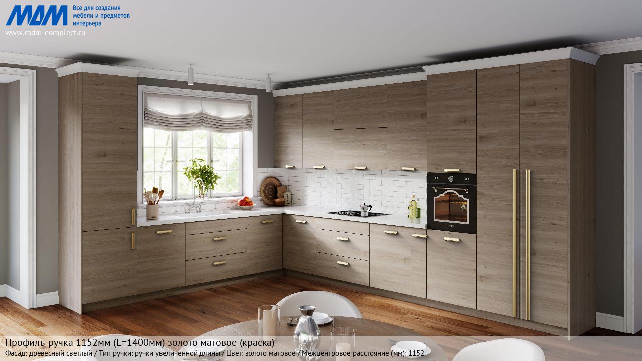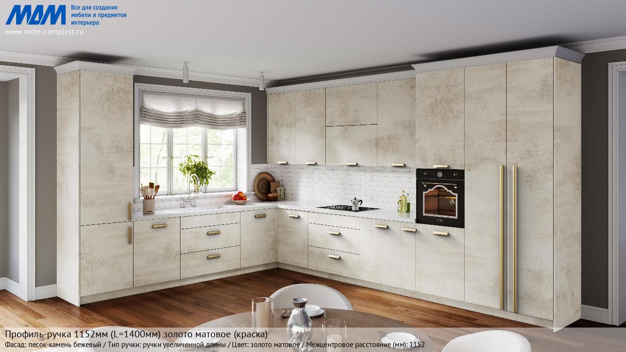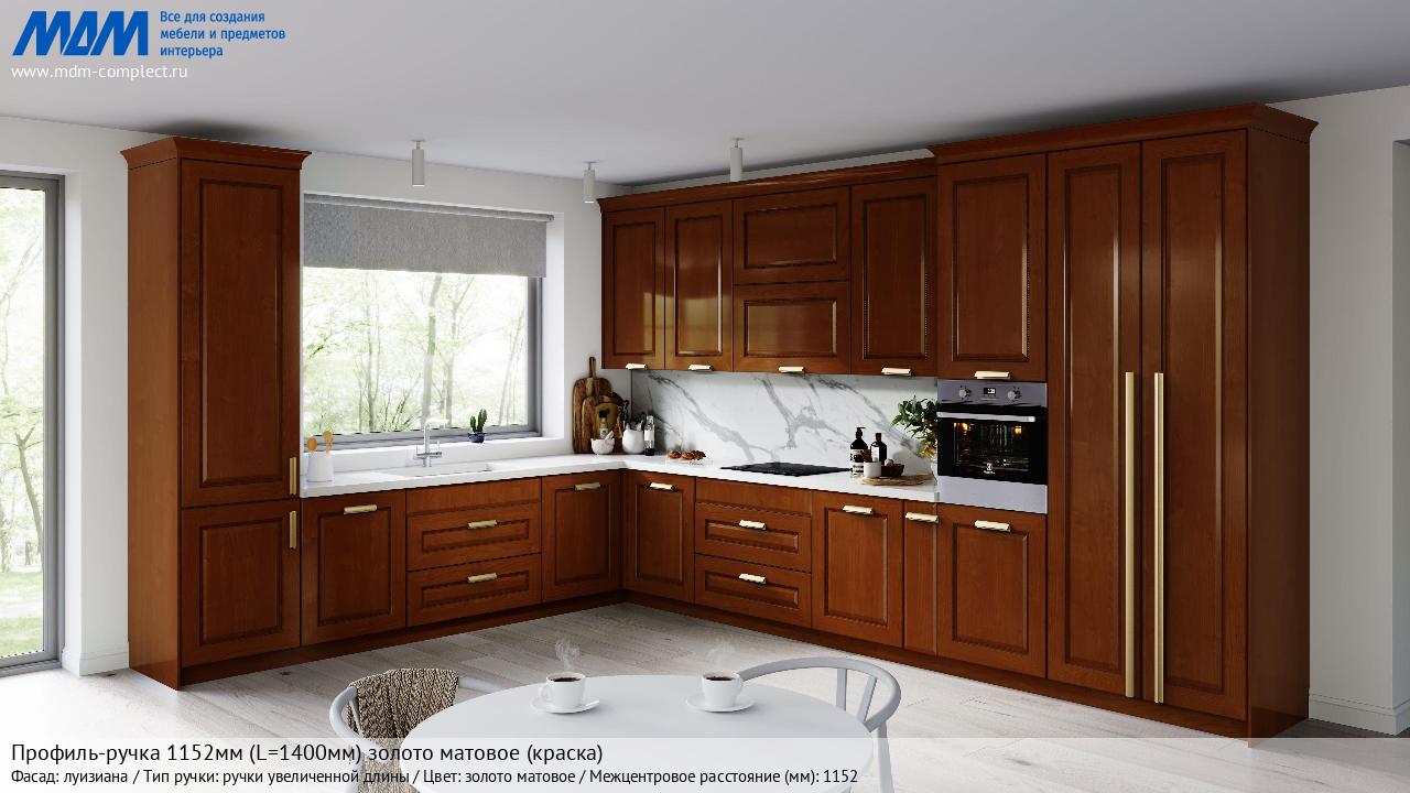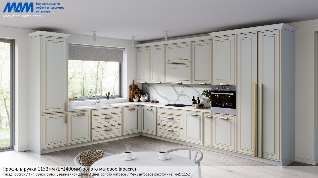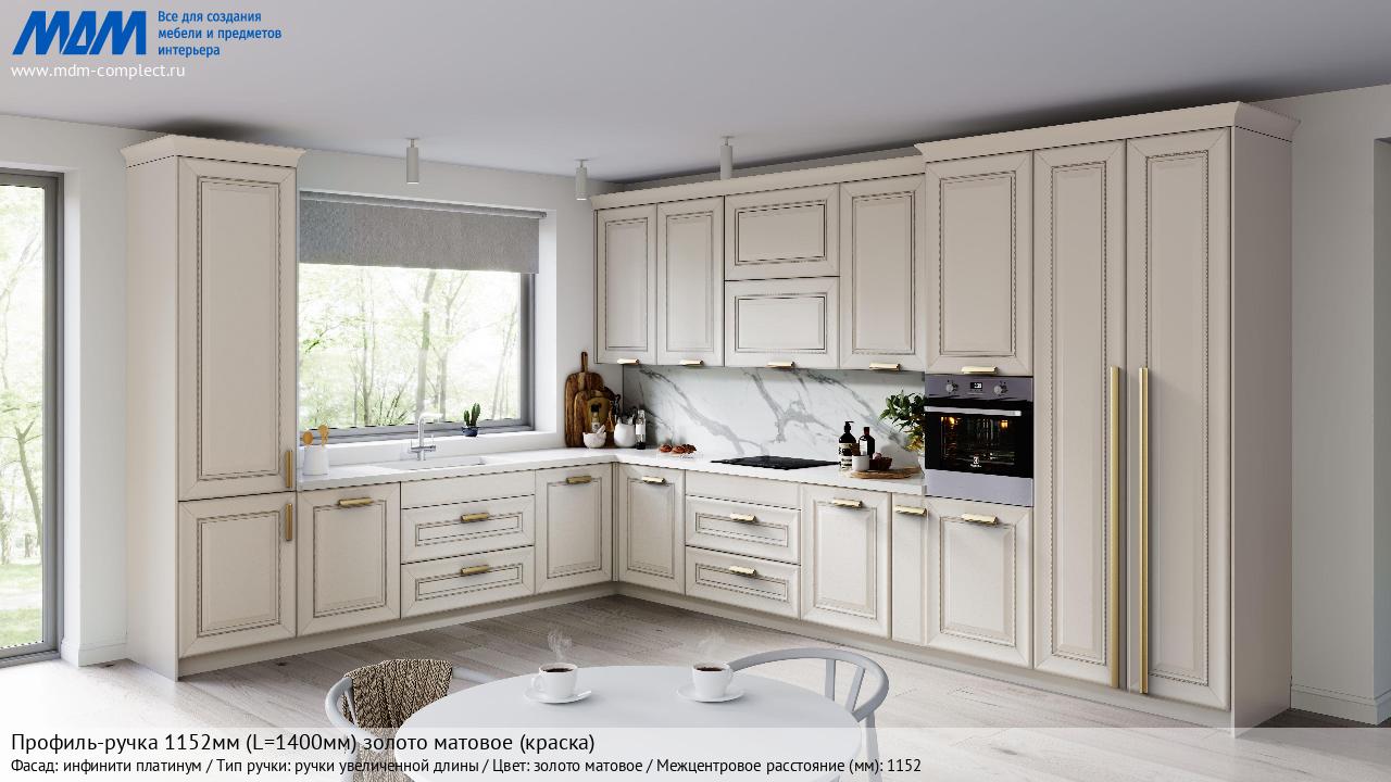 Мебельная Профиль-ручка 1152мм (L=1400мм) золото матовое (краска) на различных фасадах в кухонном интерьере в стиле классика, лофт, модерн.