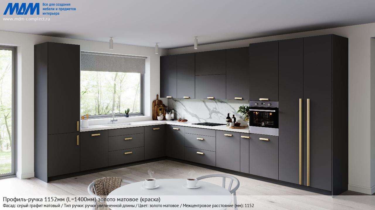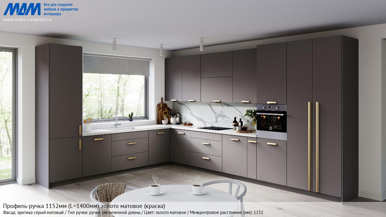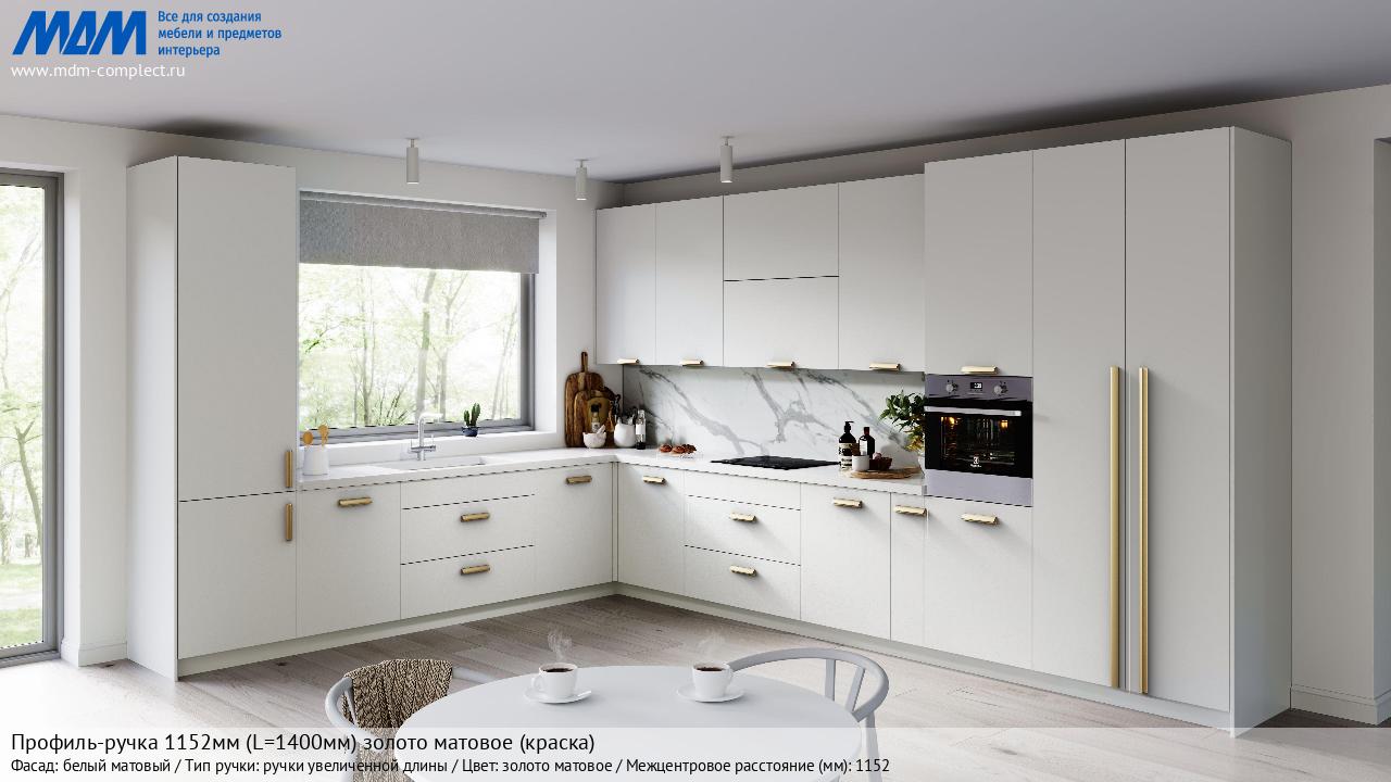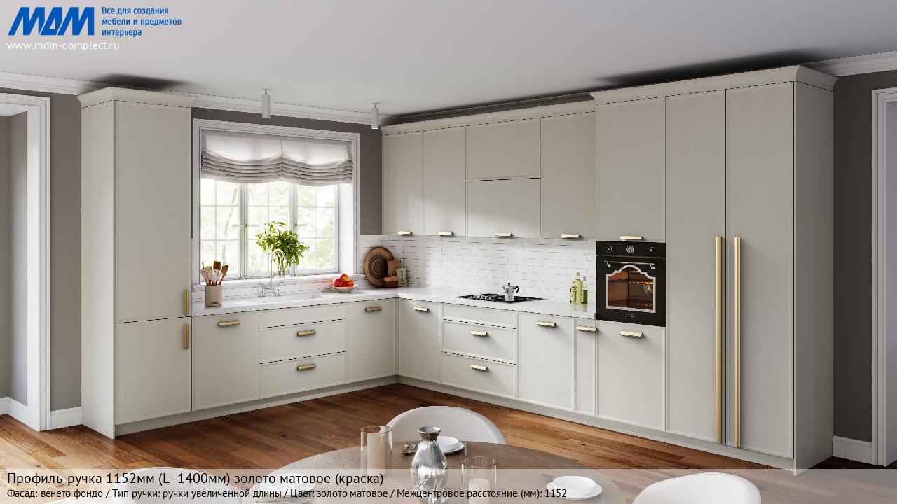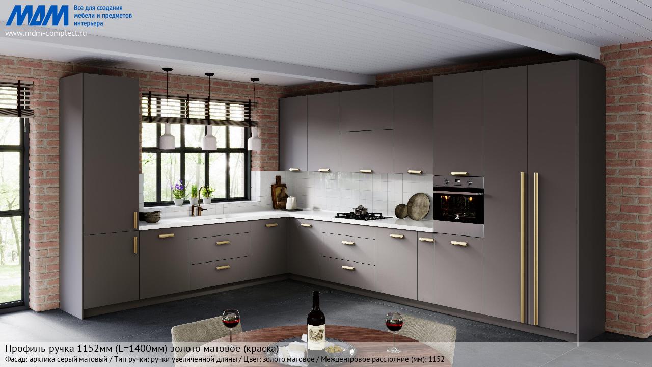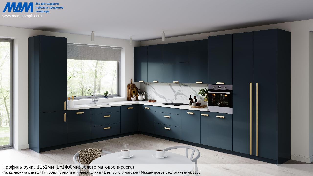 Мебельная Профиль-ручка 1152мм (L=1400мм) золото матовое (краска) на различных фасадах в кухонном интерьере в стиле классика, лофт, модерн.