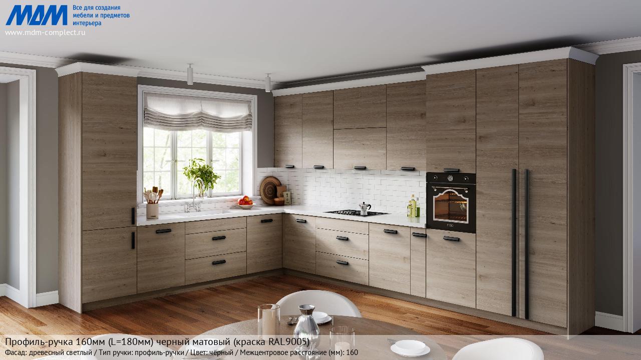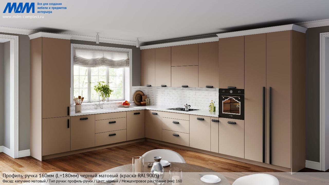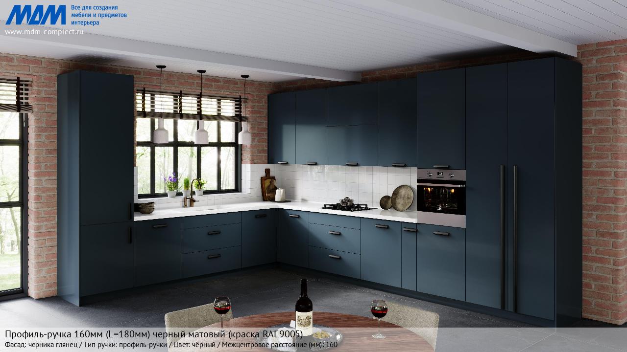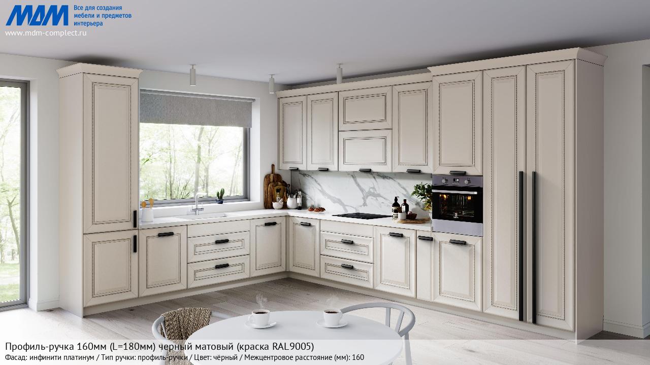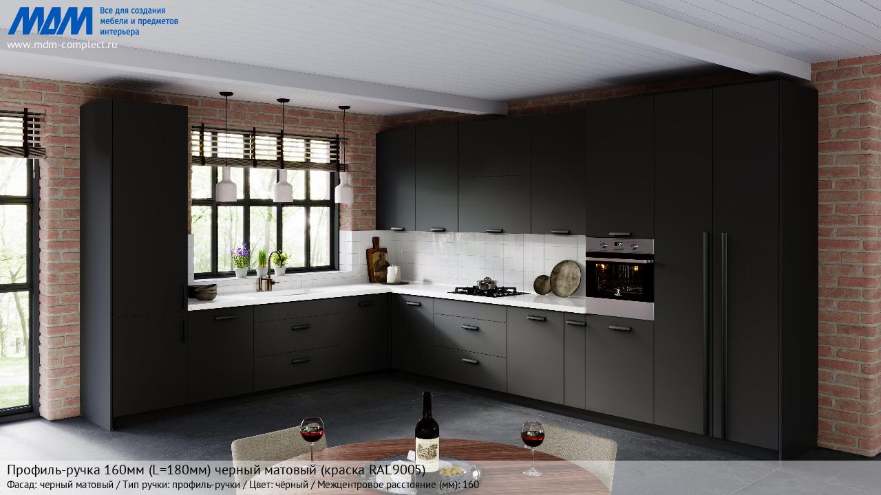 Профиль-ручка 160мм (L=180мм) черный матовый (краска RAL9005) (PH.RU30.180.BL) в готовой кухне на различных фасадах