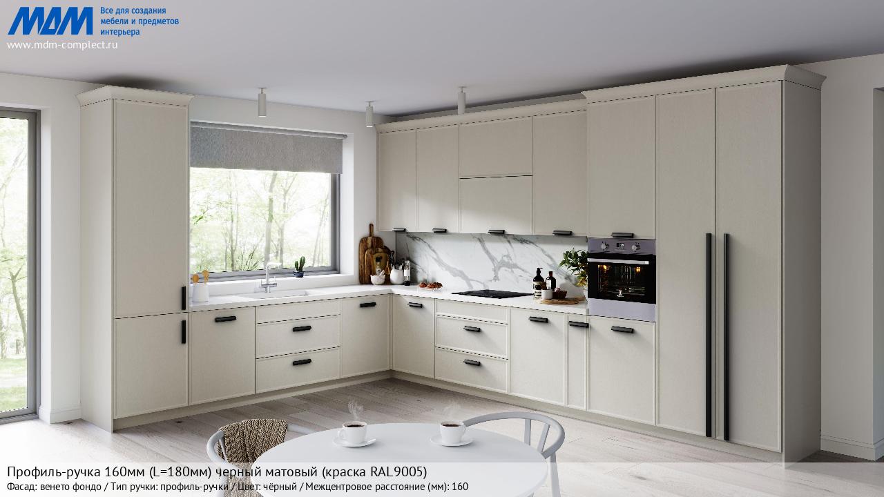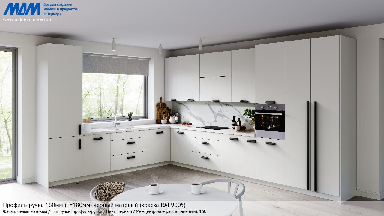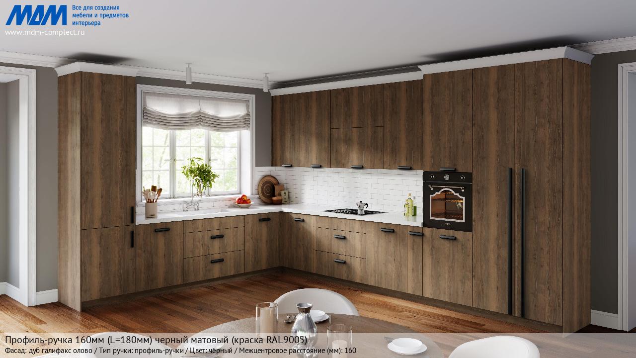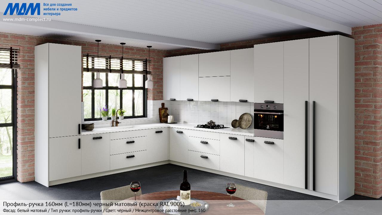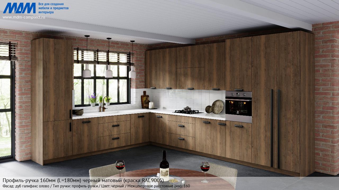 Профиль-ручка 160мм (L=180мм) черный матовый (краска RAL9005) (PH.RU30.180.BL) в готовой кухне на различных фасадах