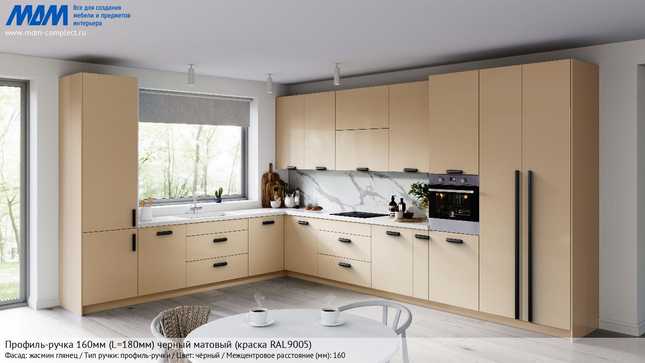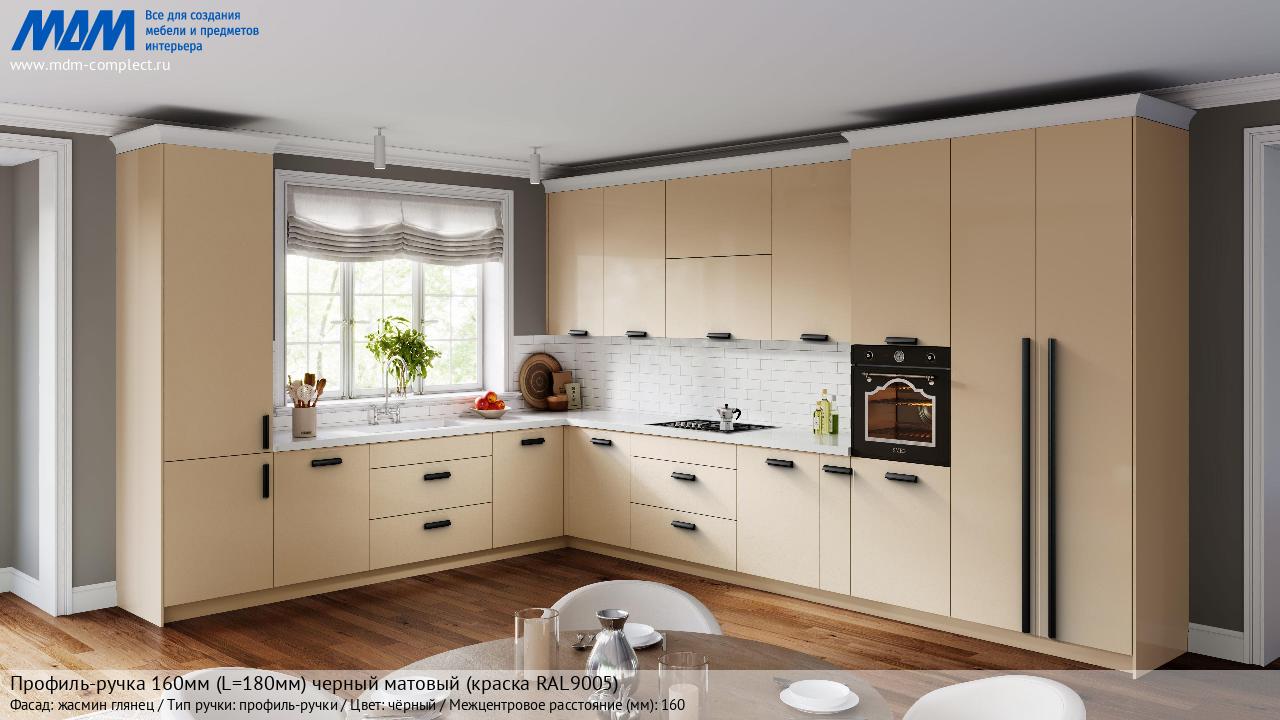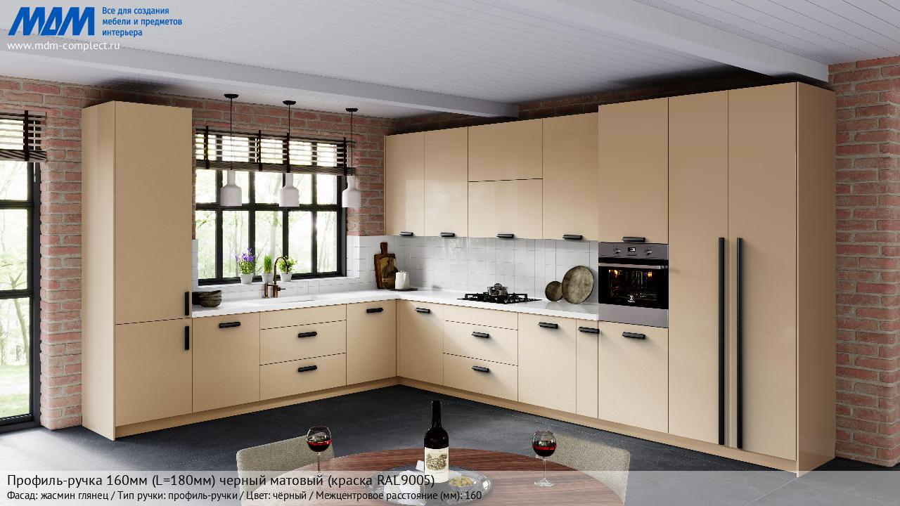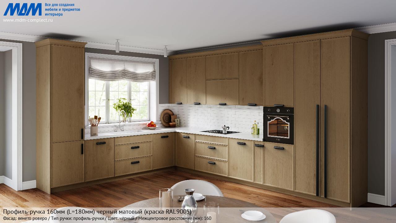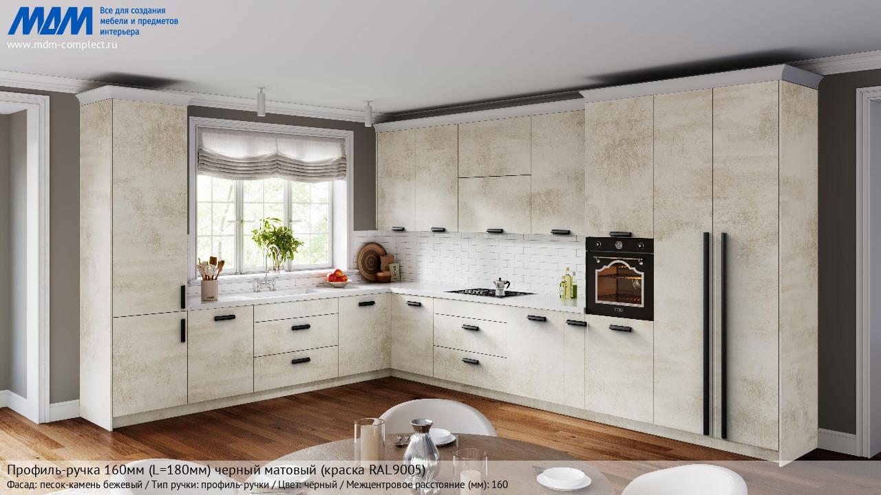 Профиль-ручка 160мм (L=180мм) черный матовый (краска RAL9005) (PH.RU30.180.BL) в готовой кухне на различных фасадах