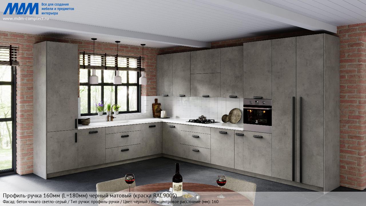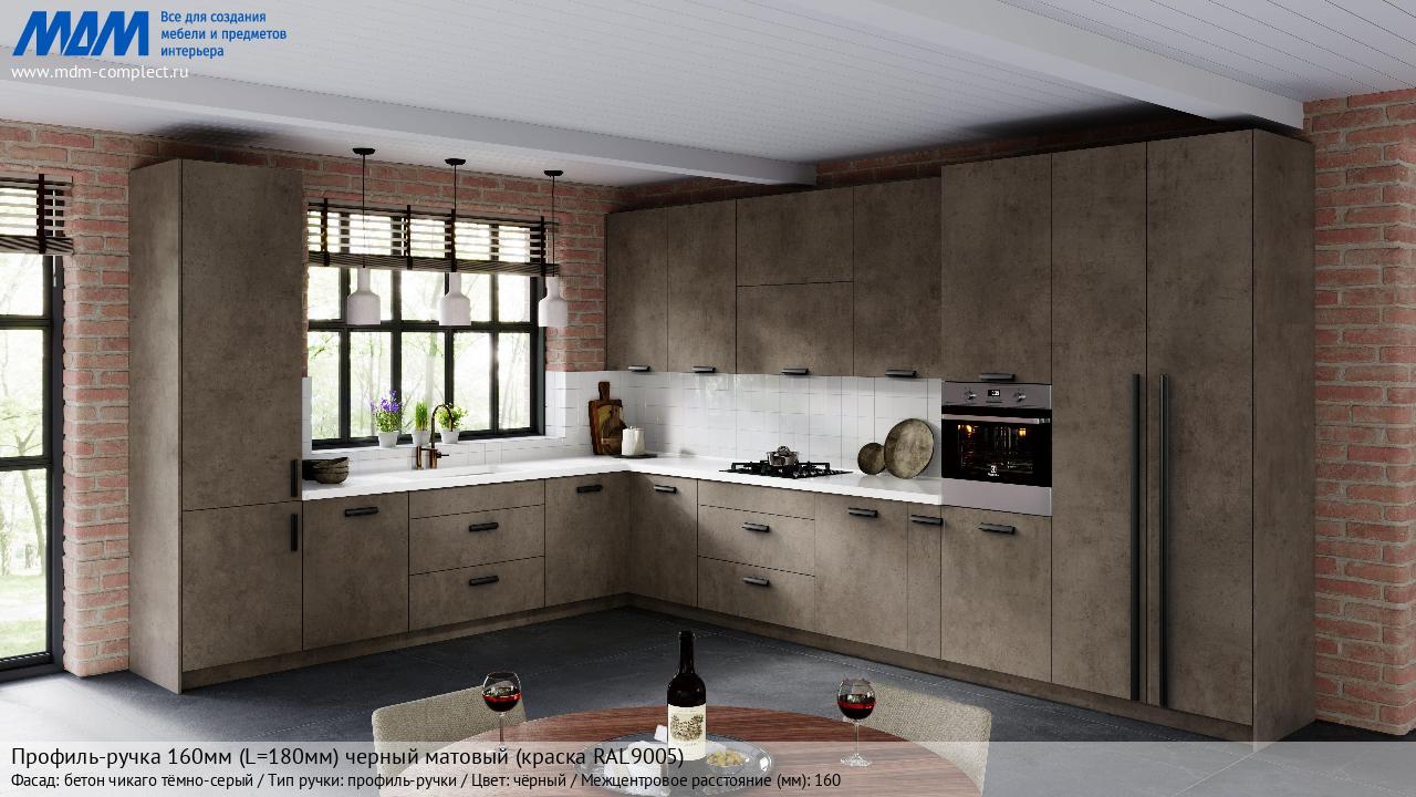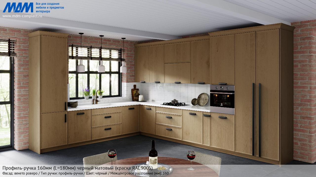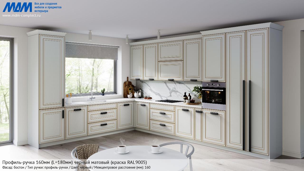 Мебельная Профиль-ручка 160мм (L=180мм) черный матовый (краска RAL9005) на различных фасадах в кухонном интерьере в стиле классика, лофт, модерн.