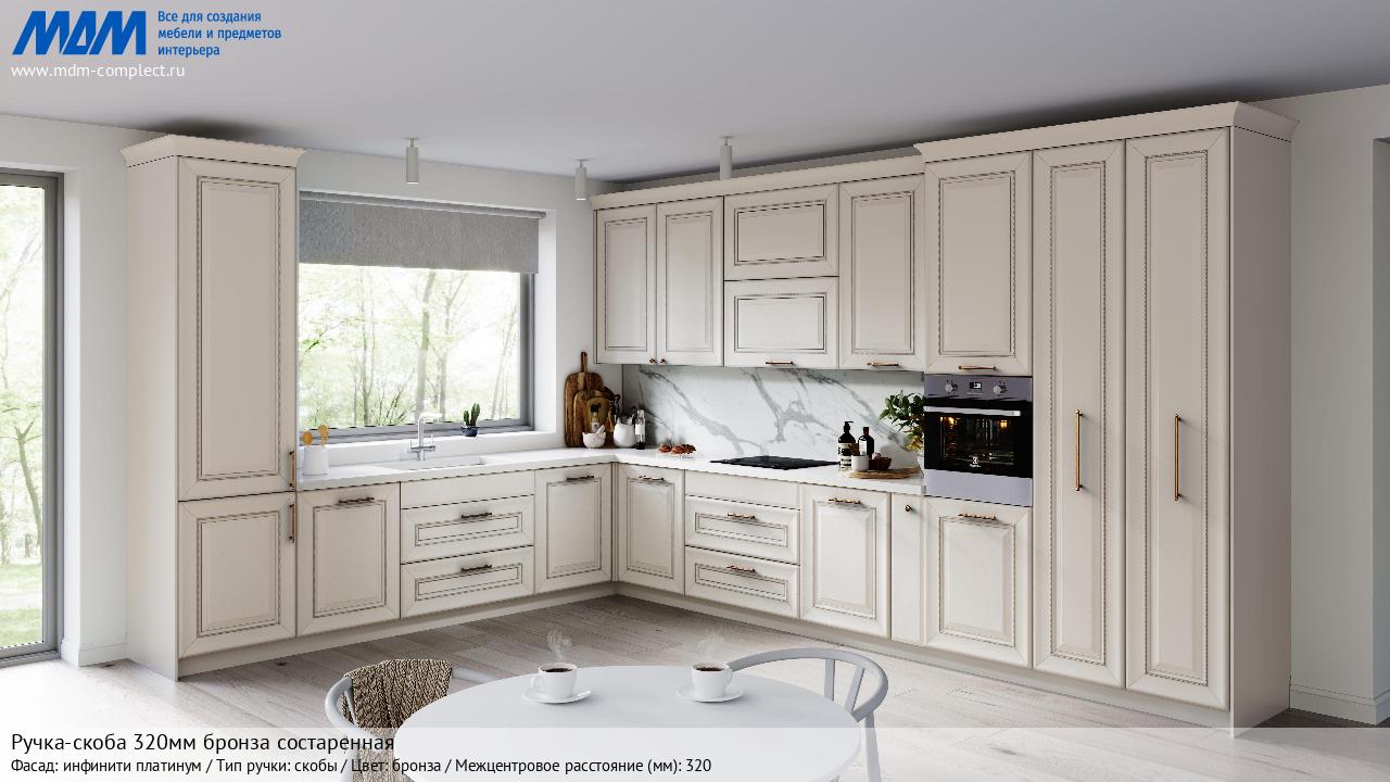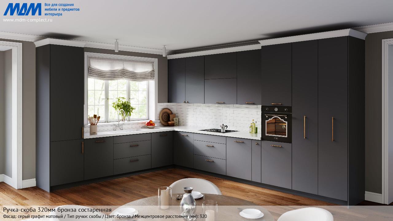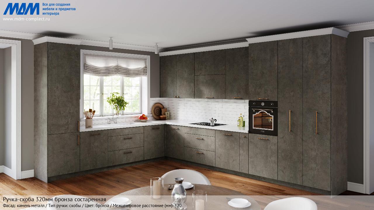 Мебельная Ручка-скоба 320мм бронза состаренная на различных фасадах в кухонном интерьере в стиле классика, лофт, модерн.