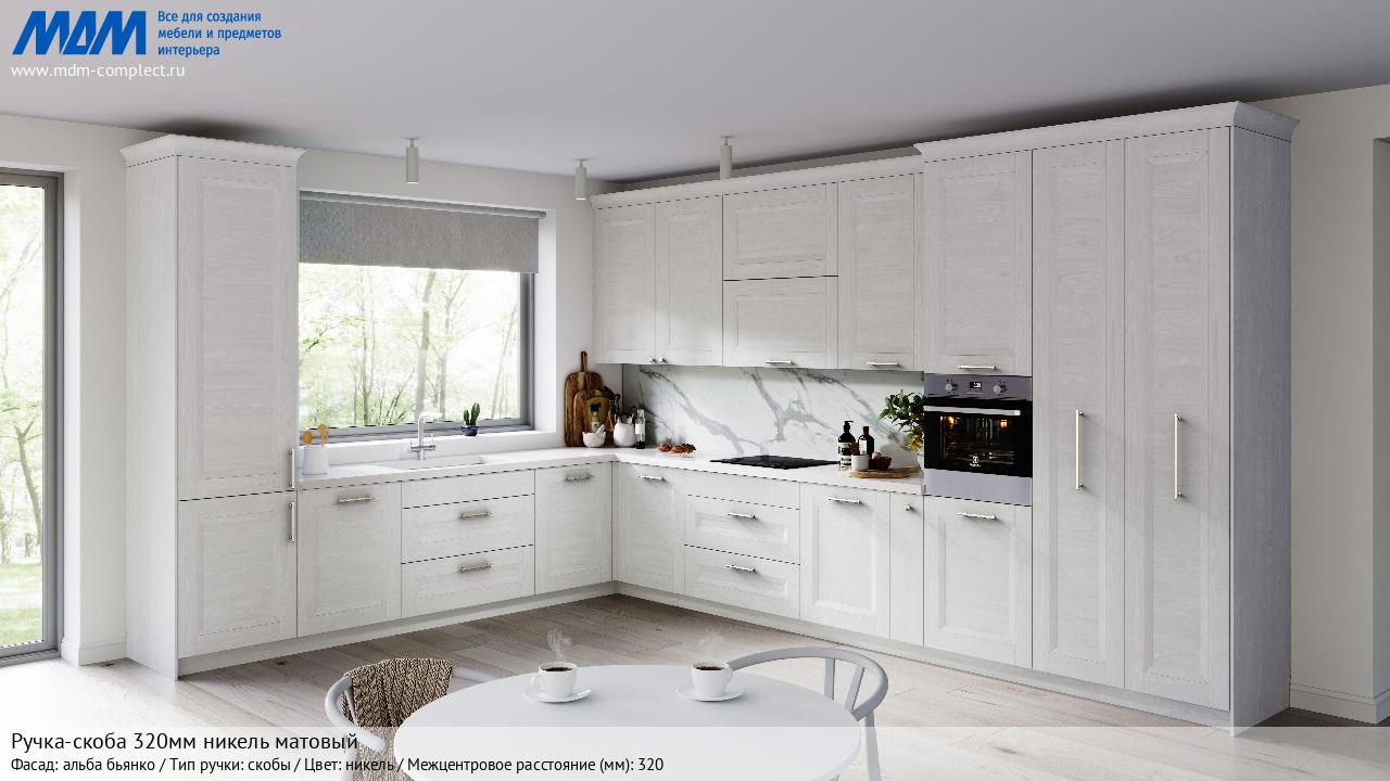 Ручка-скоба 320мм никель матовый (BH.75.320.SN) в готовой кухне на различных фасадах