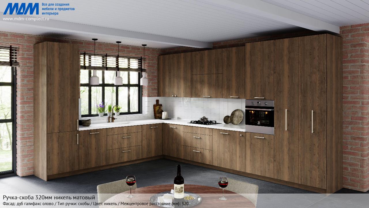 Мебельная Ручка-скоба 320мм никель матовый на различных фасадах в кухонном интерьере в стиле классика, лофт, модерн.