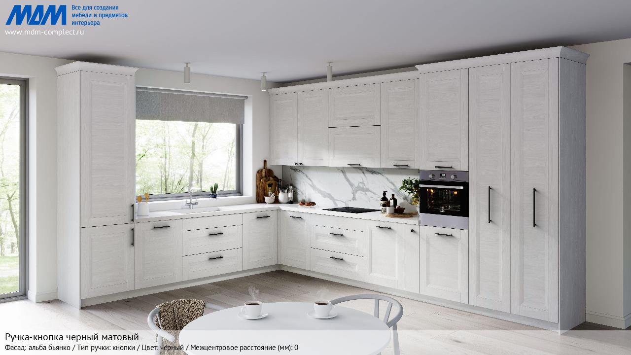 Ручка-кнопка черный матовый (KH.42.000.BLM) в готовой кухне на различных фасадах
