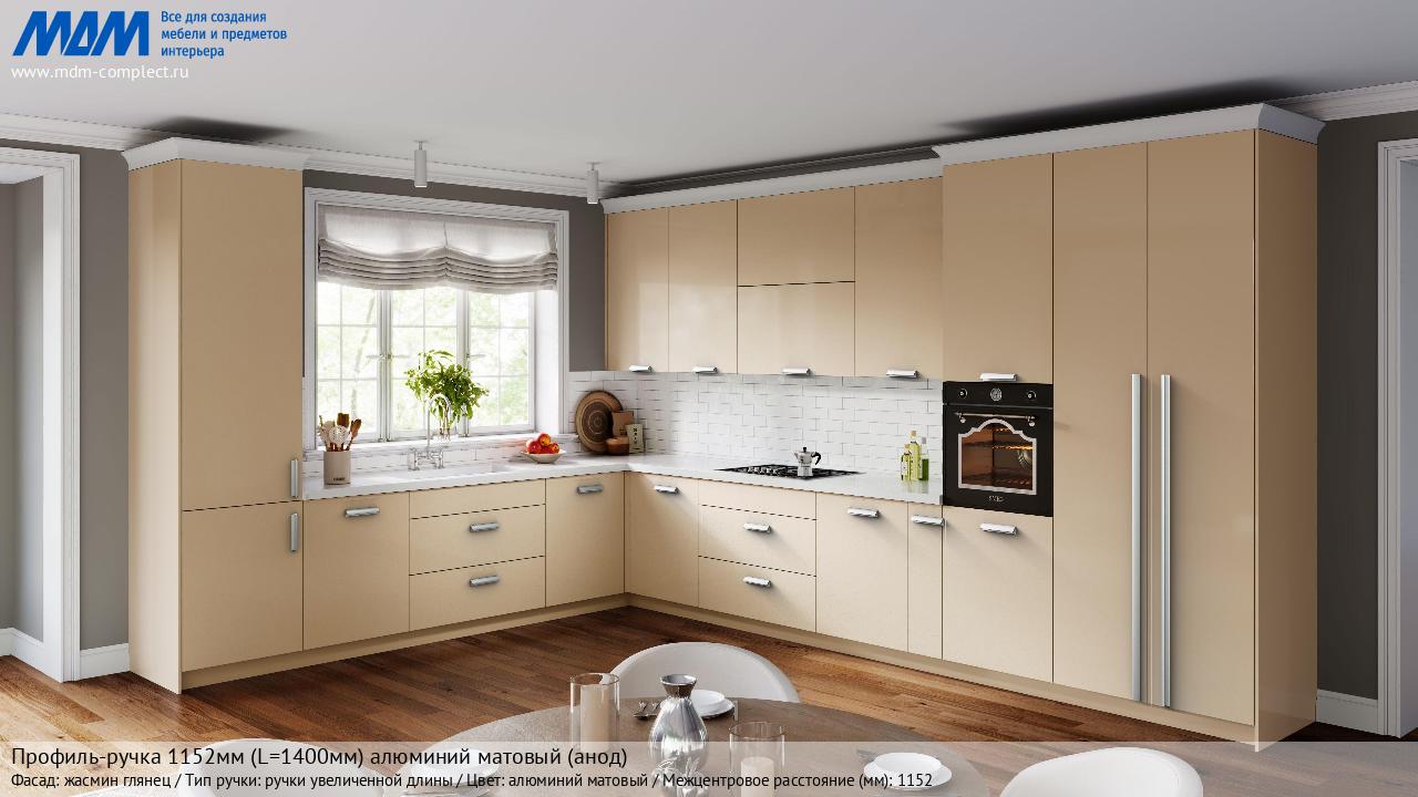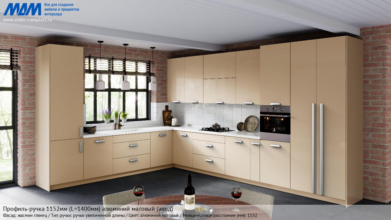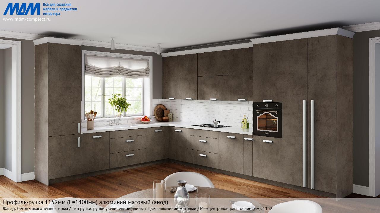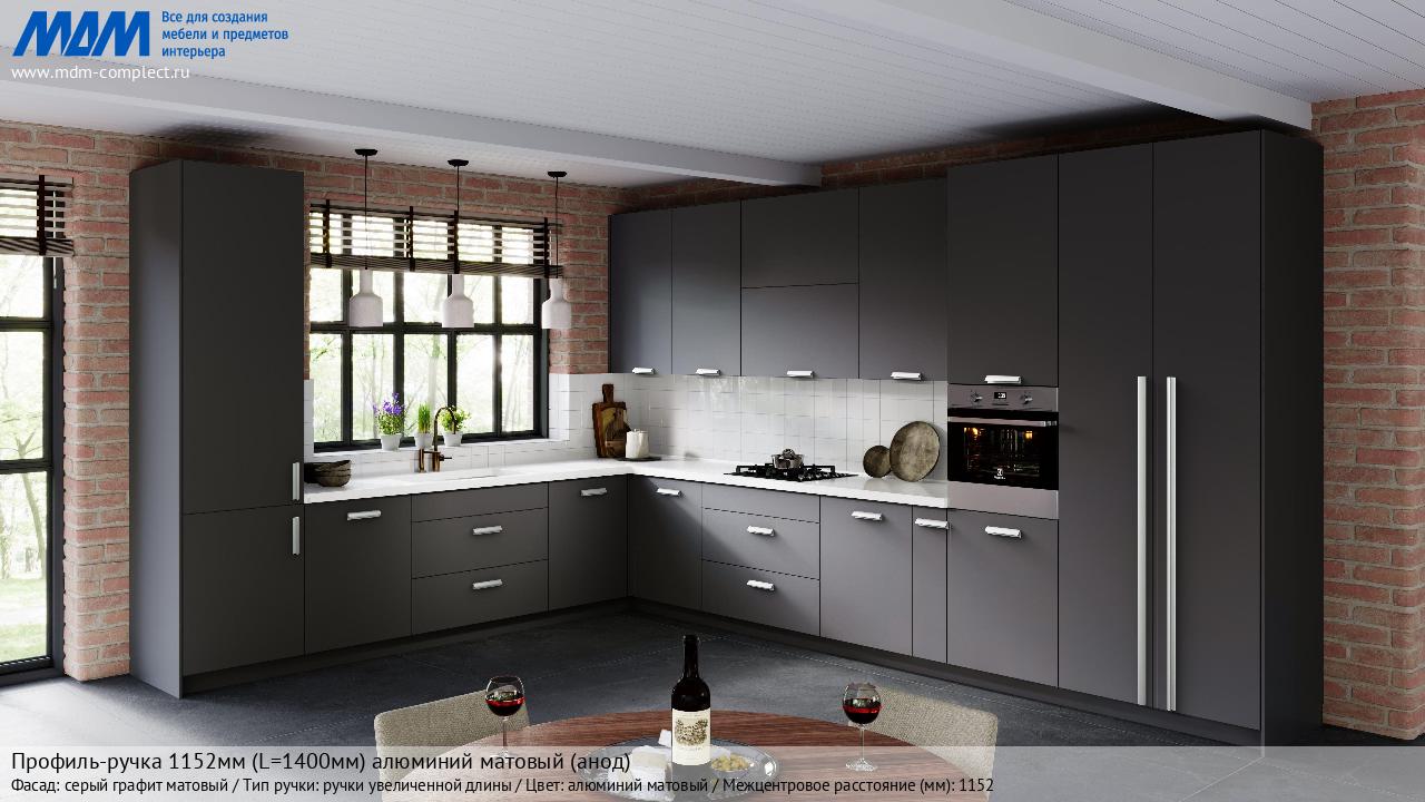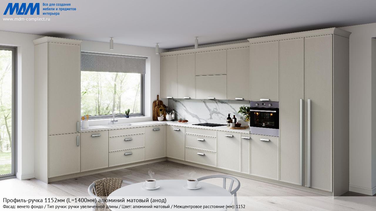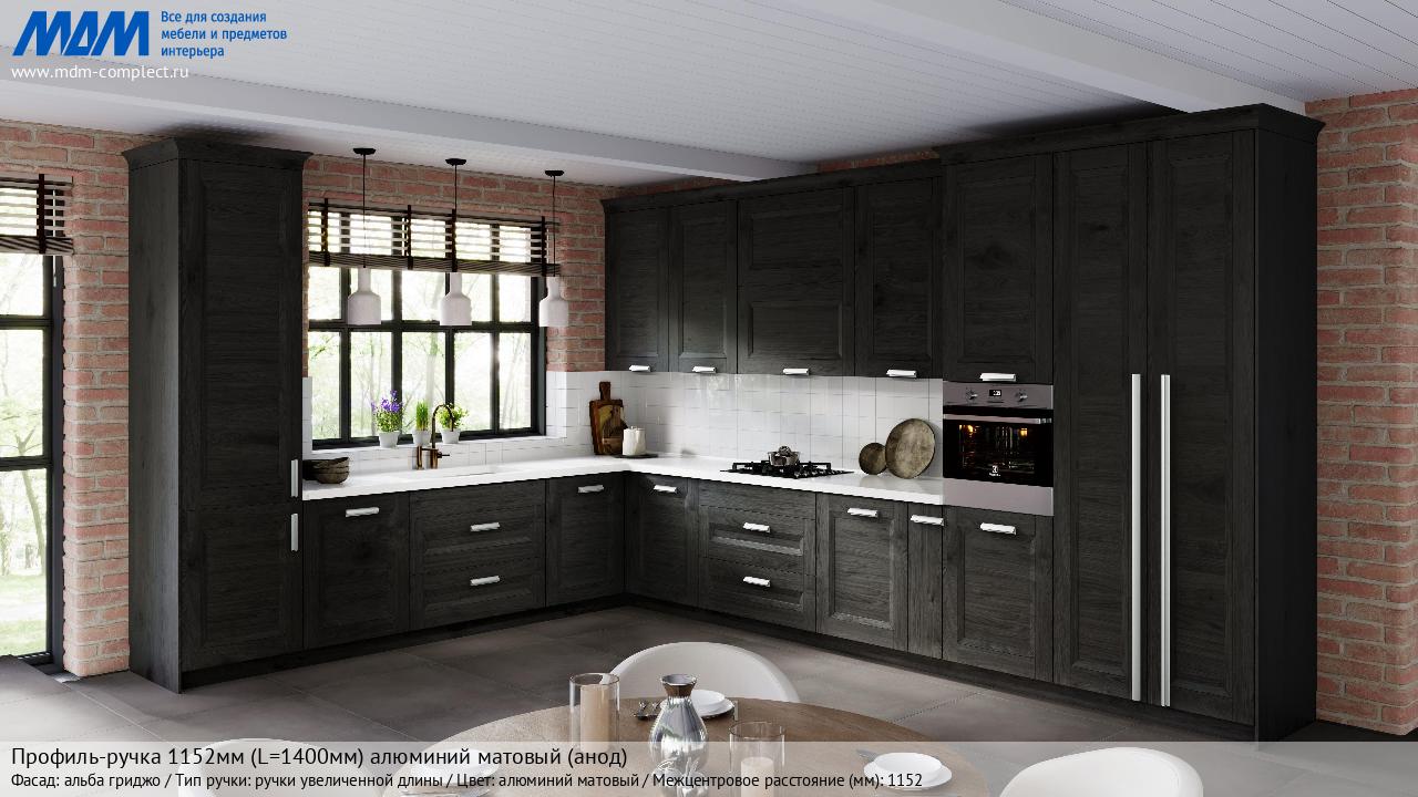 Мебельная Профиль-ручка 1152мм (L=1400мм) алюминий матовый (анод) на различных фасадах в кухонном интерьере в стиле классика, лофт, модерн.