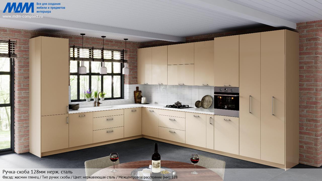 Мебельная Ручка-скоба 128мм нерж. сталь на различных фасадах в кухонном интерьере в стиле классика, лофт, модерн.