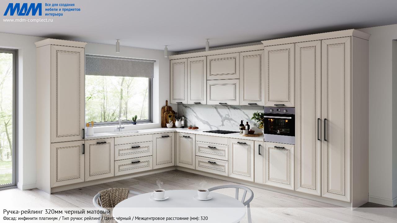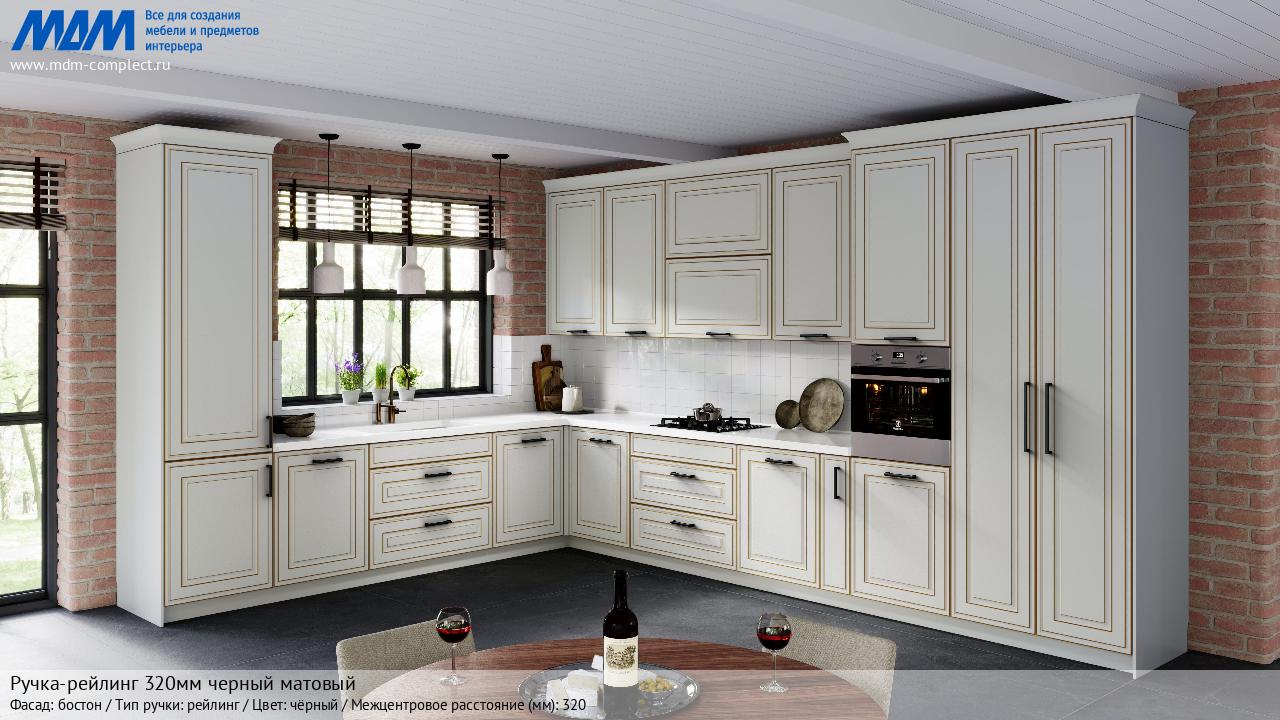 Мебельная Ручка-рейлинг 320мм черный матовый на различных фасадах в кухонном интерьере в стиле классика, лофт, модерн.