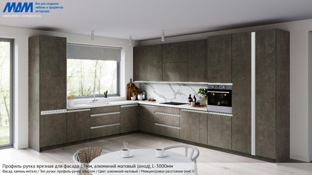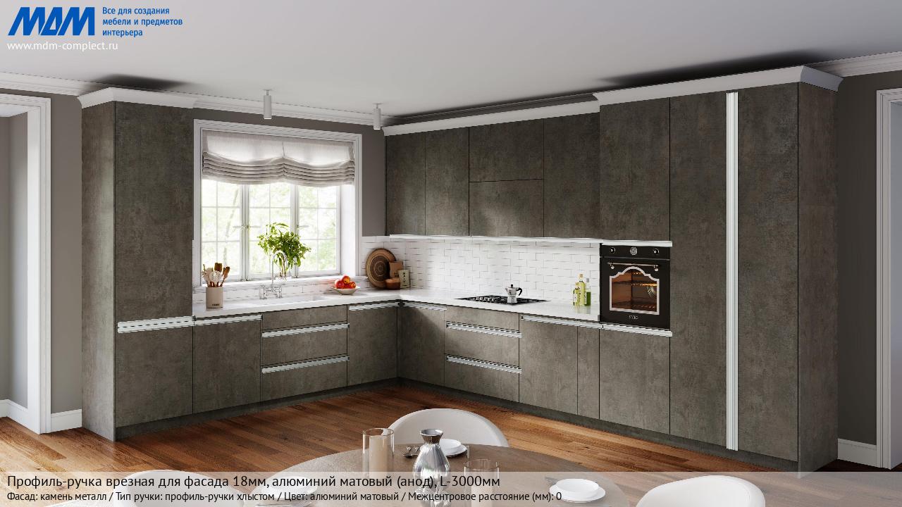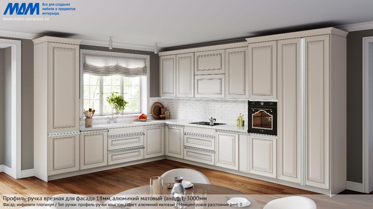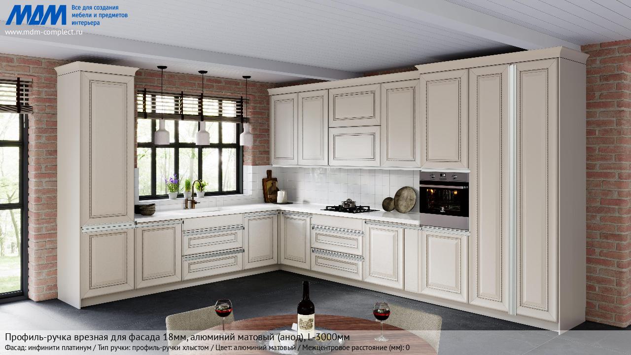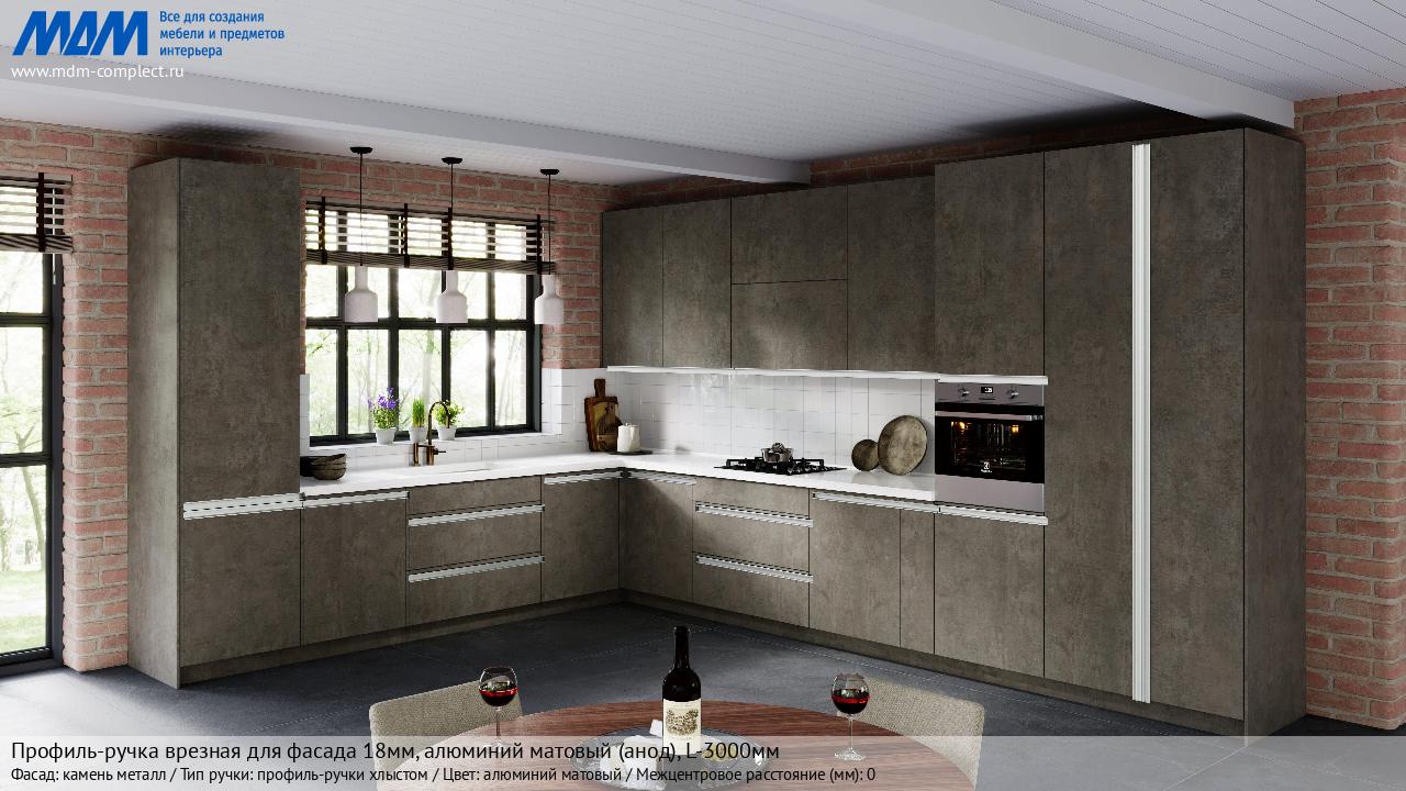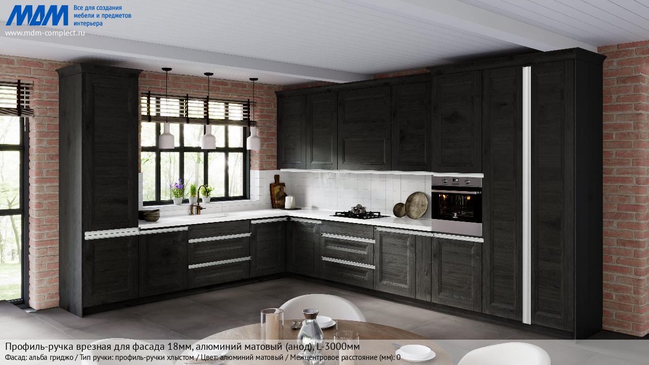Мебельная Профиль-ручка врезная для фасада 18мм, алюминий матовый (анод), L-3000мм на различных фасадах в кухонном интерьере в стиле классика, лофт, модерн.