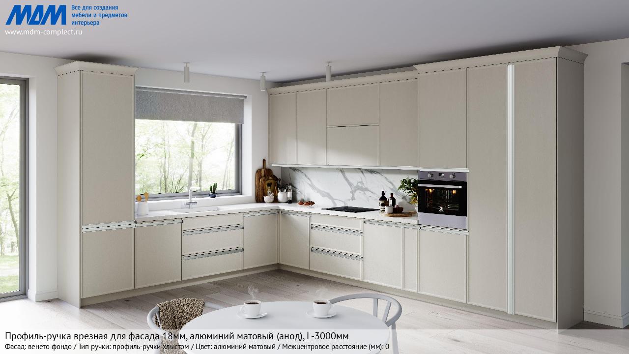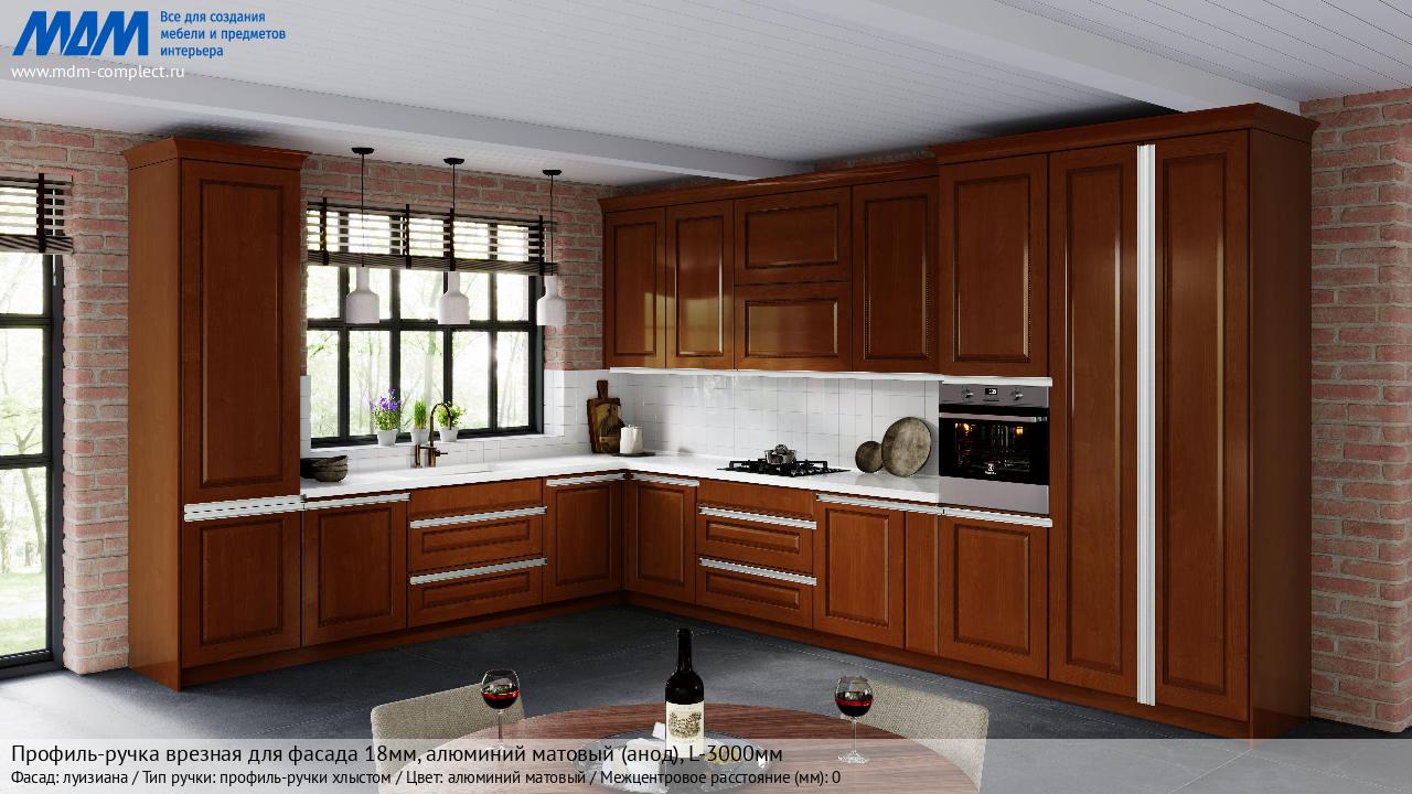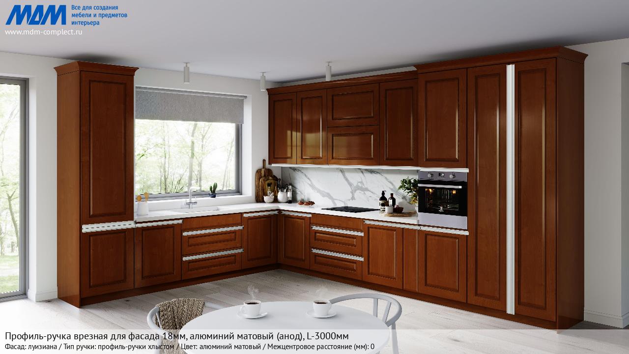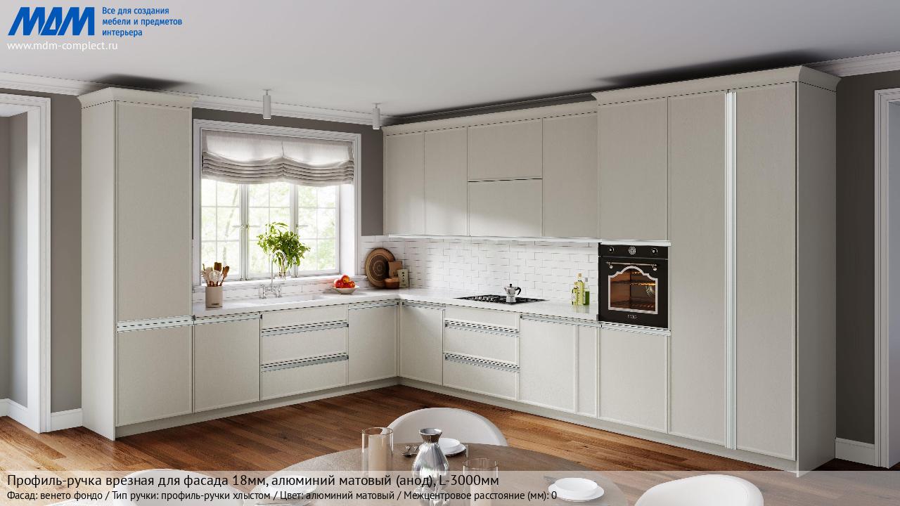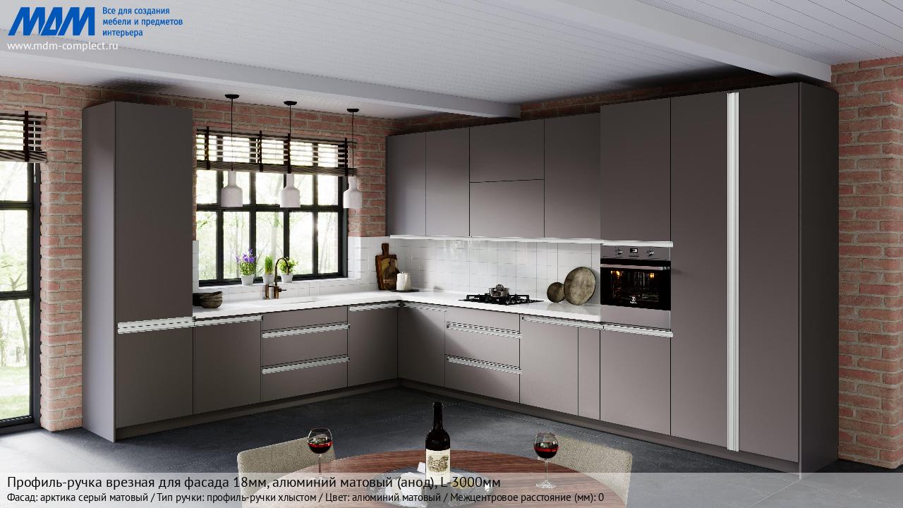 Мебельная Профиль-ручка врезная для фасада 18мм, алюминий матовый (анод), L-3000мм на различных фасадах в кухонном интерьере в стиле классика, лофт, модерн.