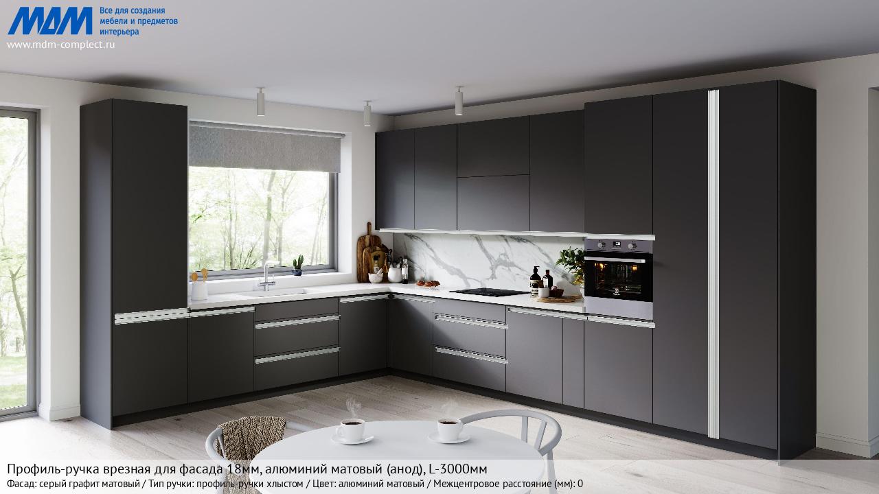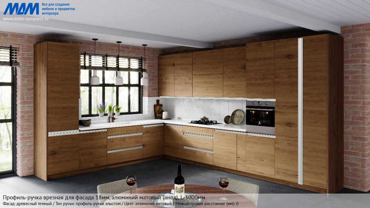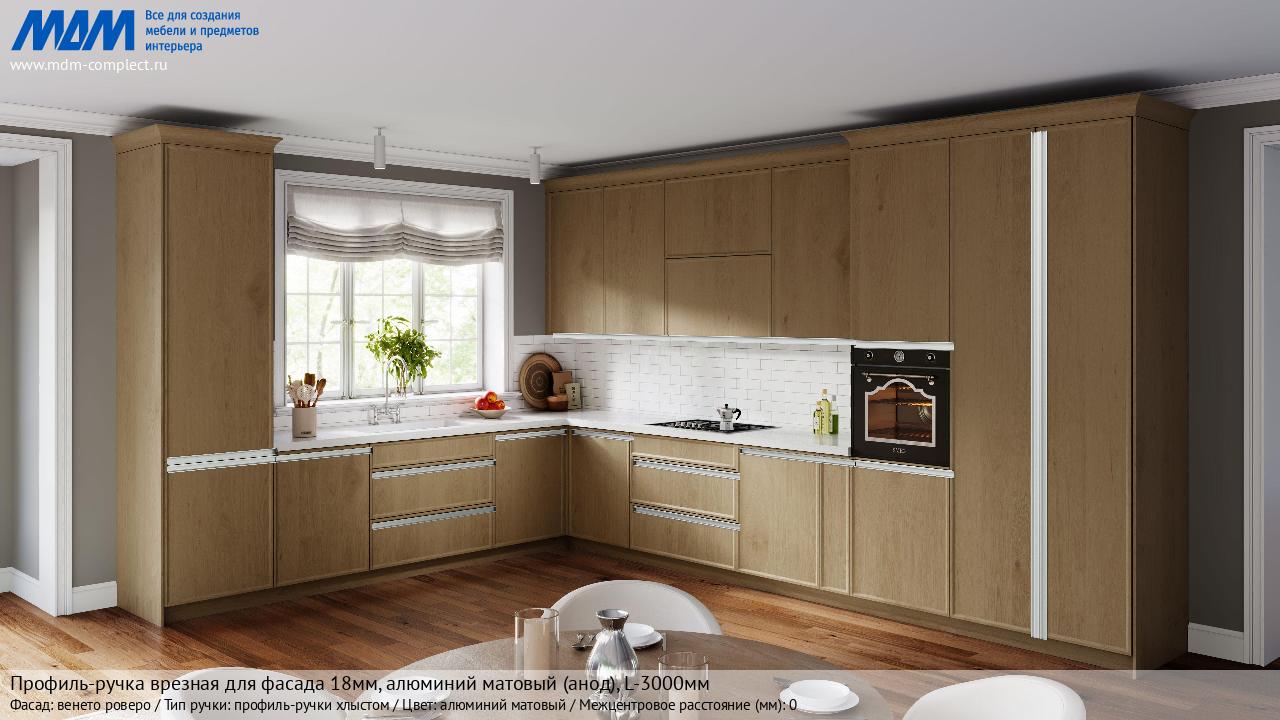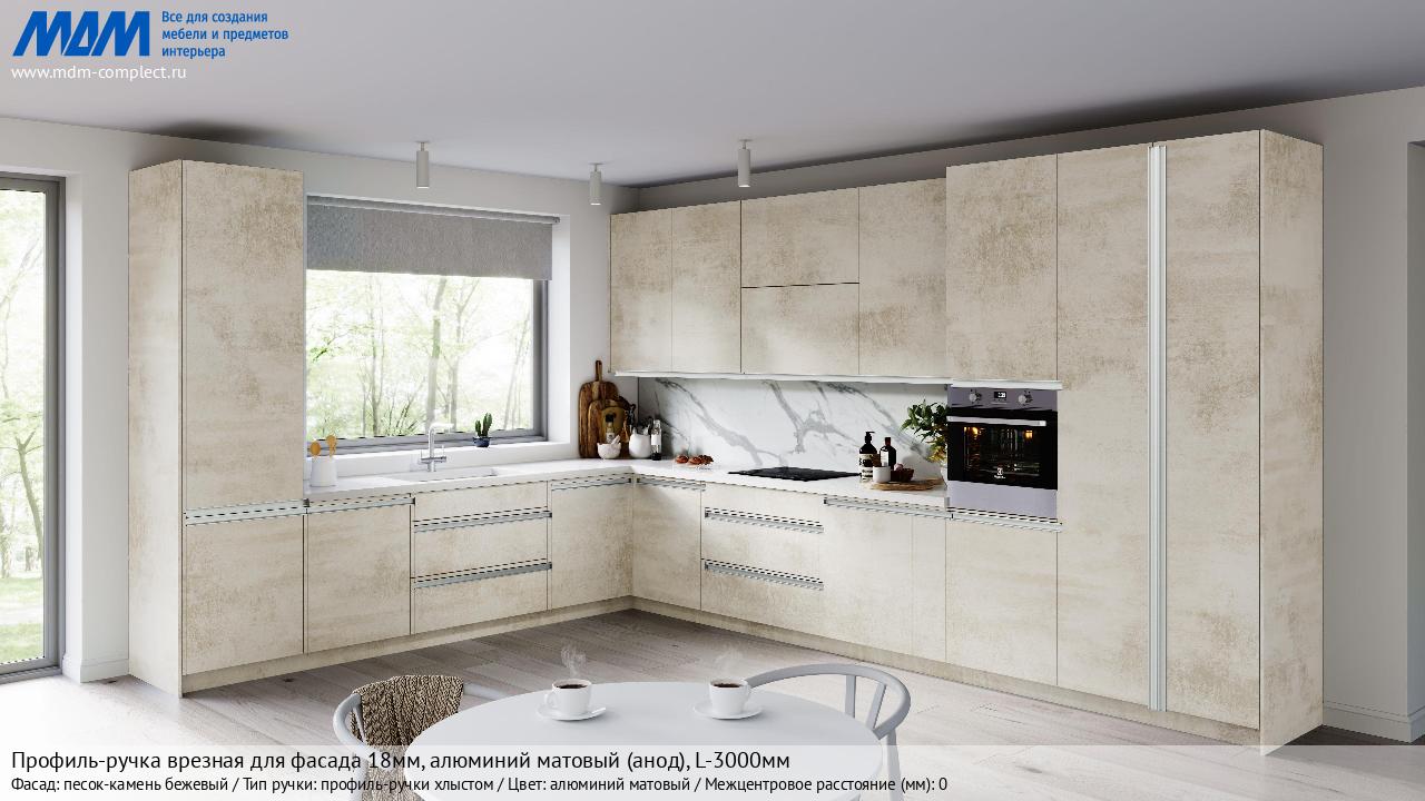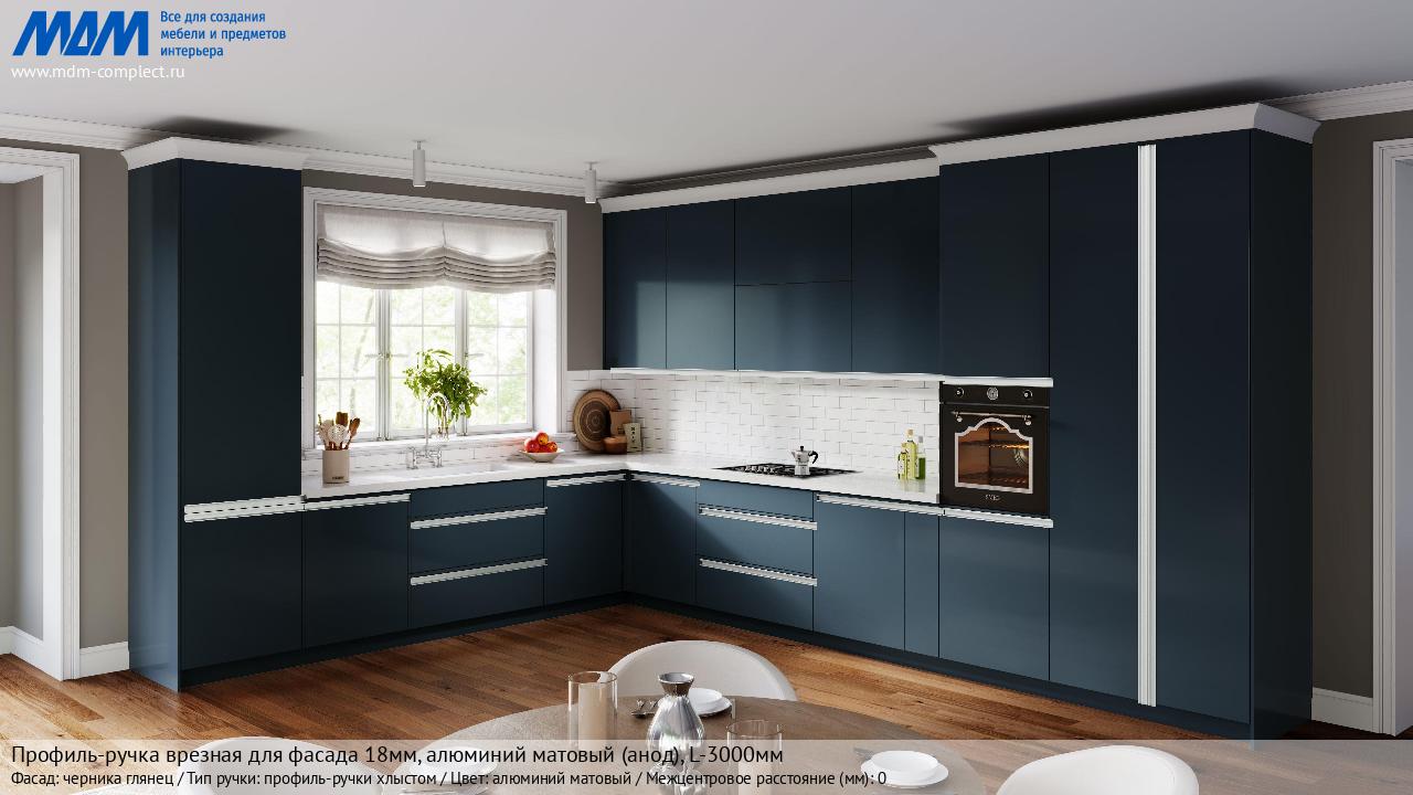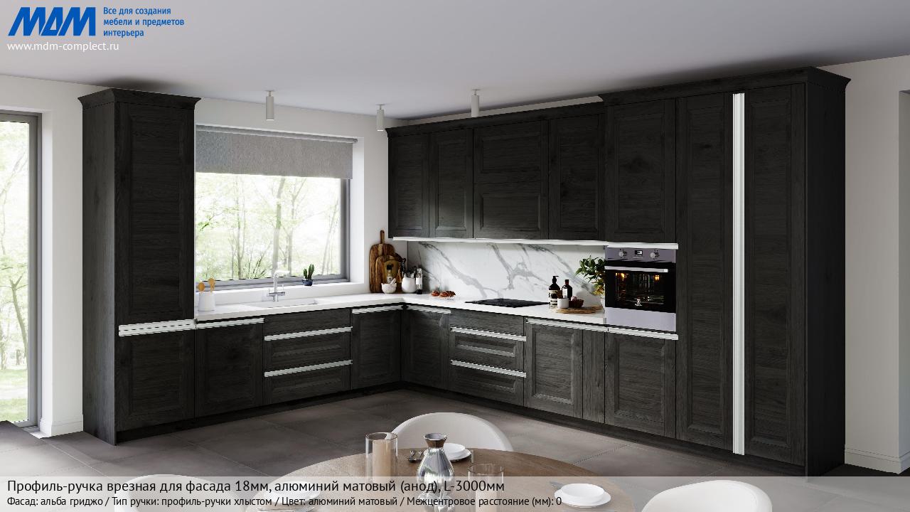 Мебельная Профиль-ручка врезная для фасада 18мм, алюминий матовый (анод), L-3000мм на различных фасадах в кухонном интерьере в стиле классика, лофт, модерн.