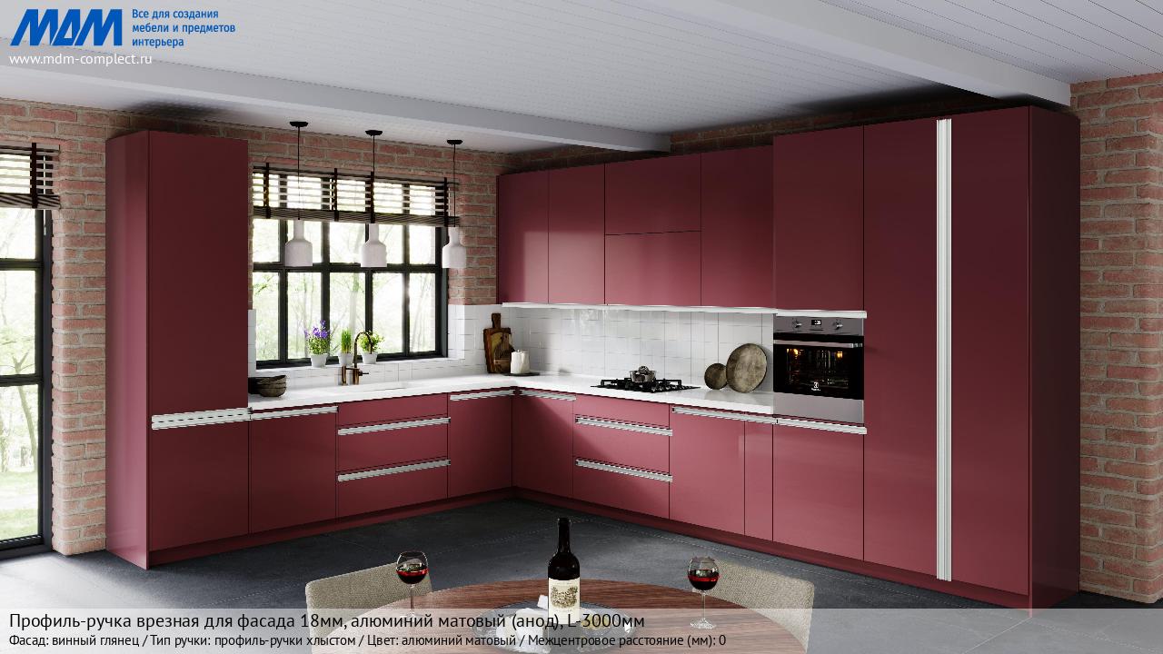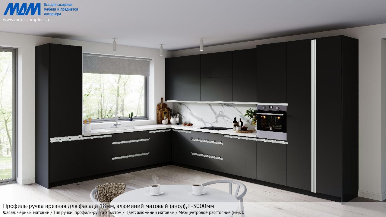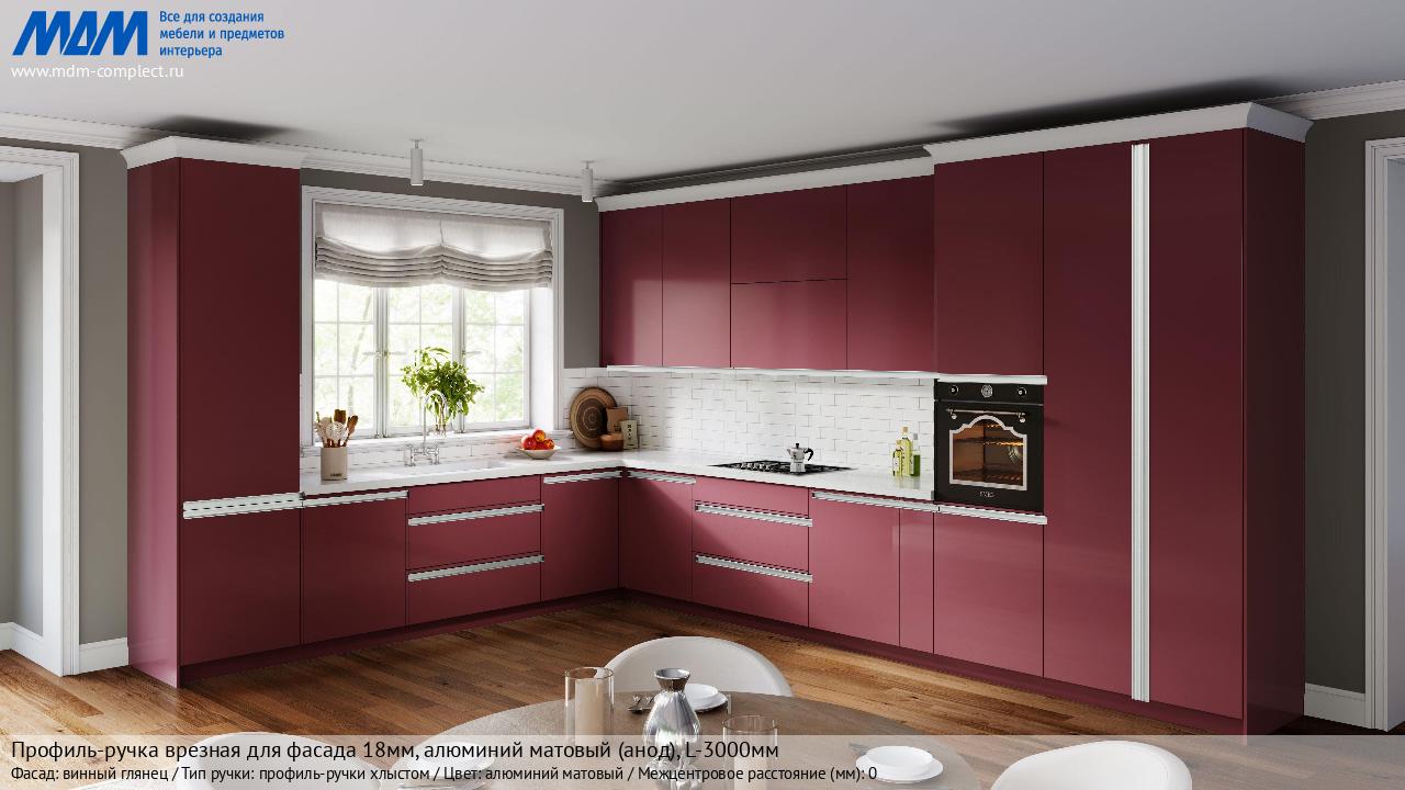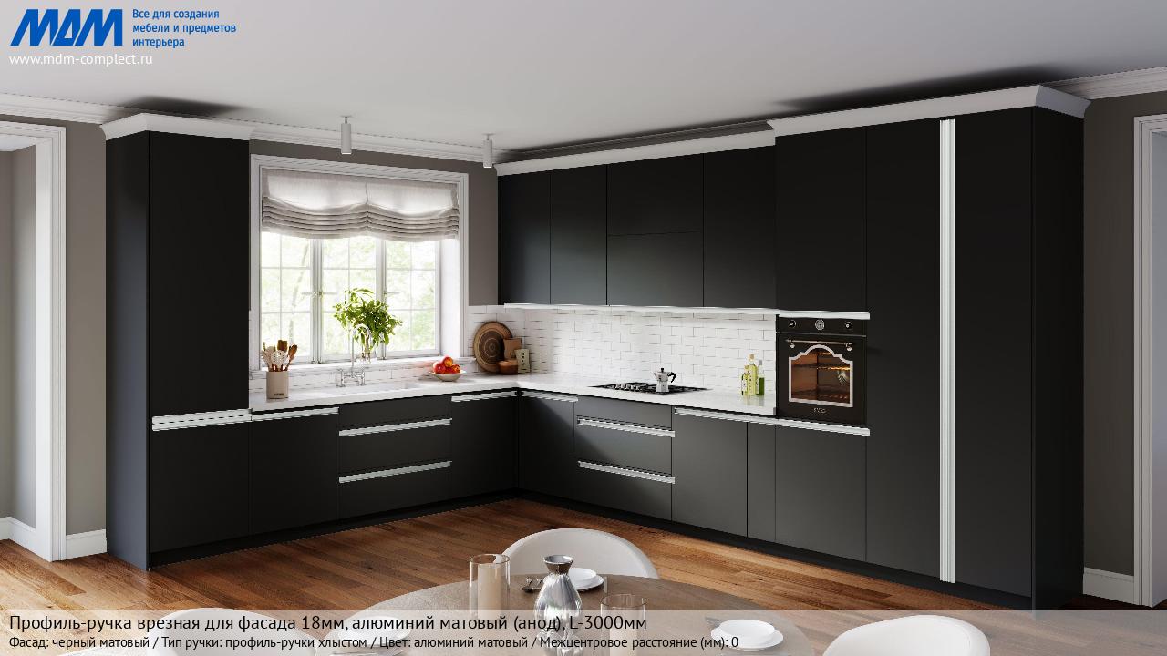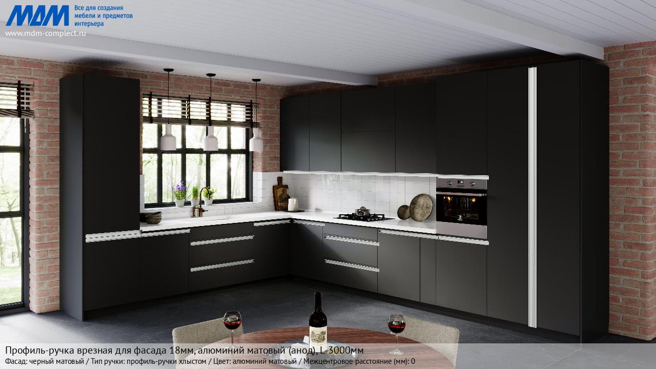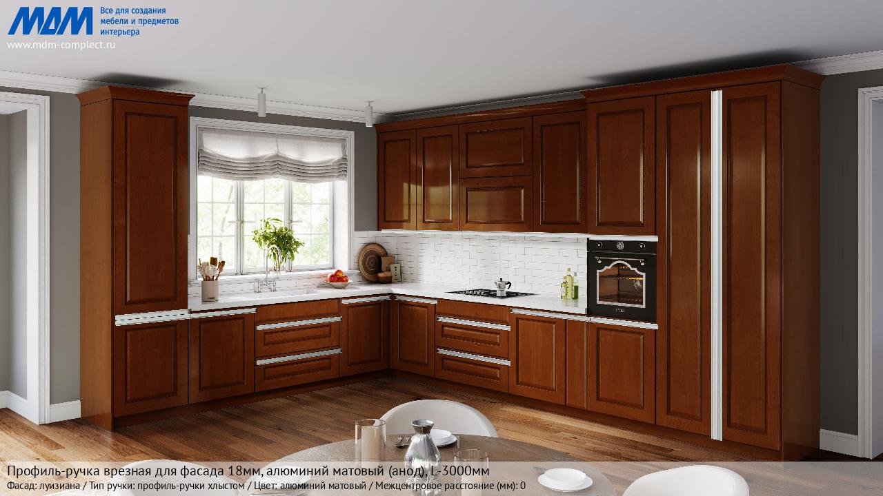 Мебельная Профиль-ручка врезная для фасада 18мм, алюминий матовый (анод), L-3000мм на различных фасадах в кухонном интерьере в стиле классика, лофт, модерн.