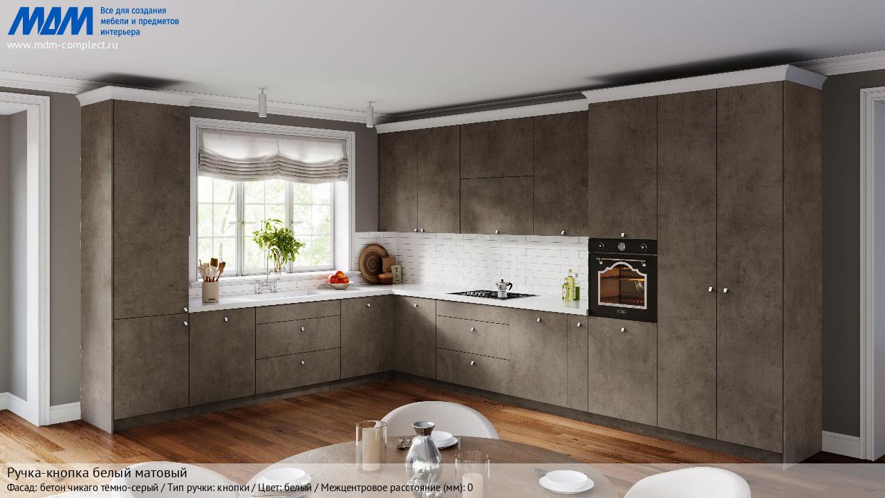 Мебельная Ручка-кнопка белый матовый на различных фасадах в кухонном интерьере в стиле классика, лофт, модерн.