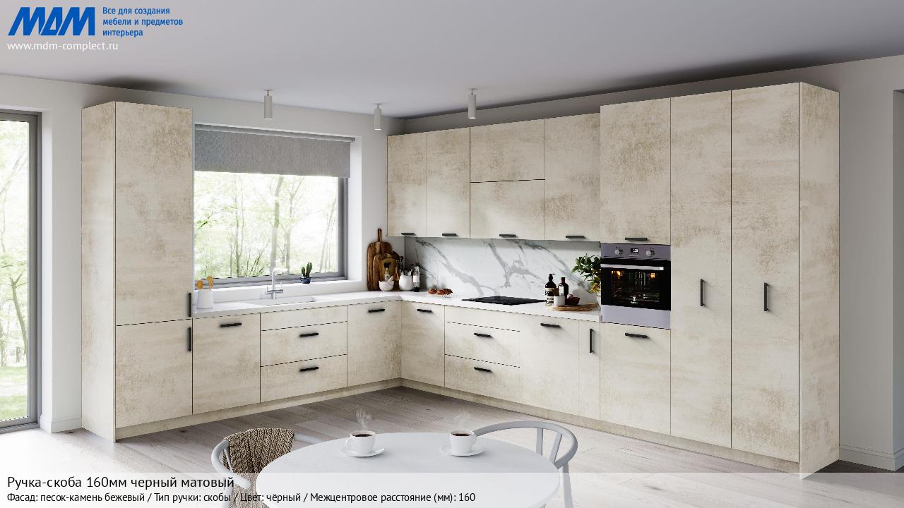 Мебельная Ручка-скоба 160мм черный матовый на различных фасадах в кухонном интерьере в стиле классика, лофт, модерн.