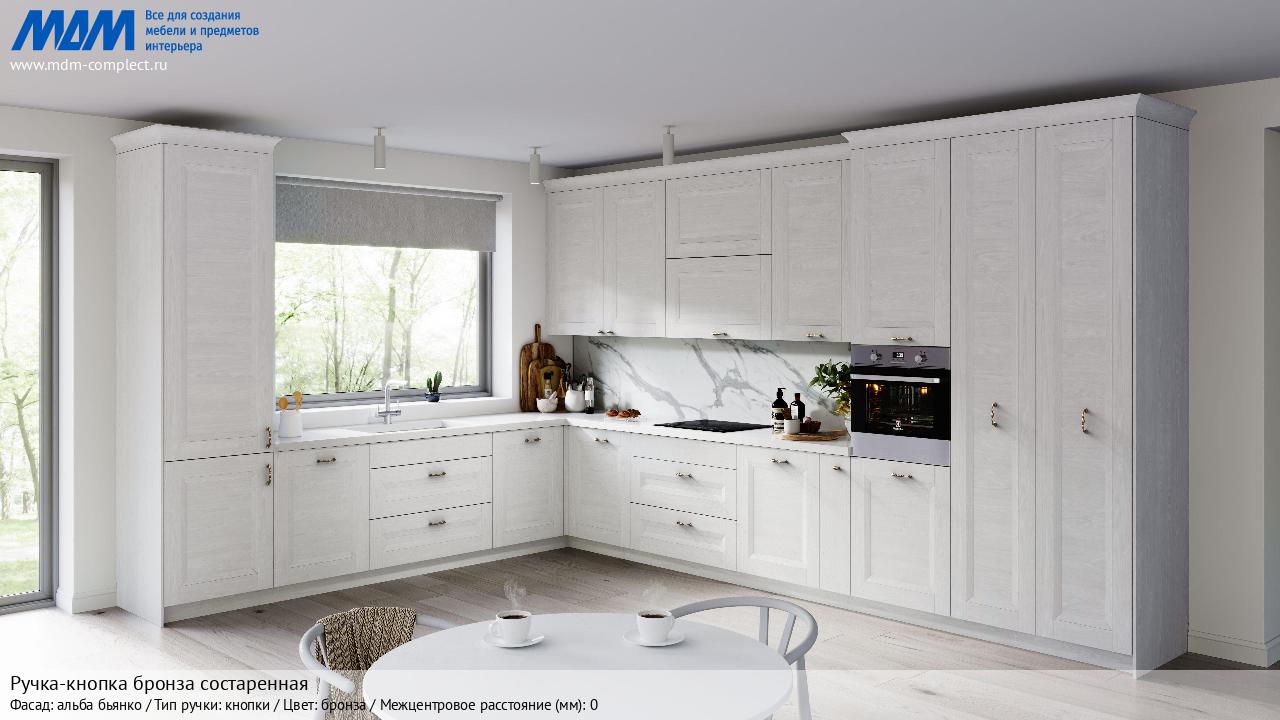 Мебельная Ручка-кнопка бронза состаренная на различных фасадах в кухонном интерьере в стиле классика, лофт, модерн.