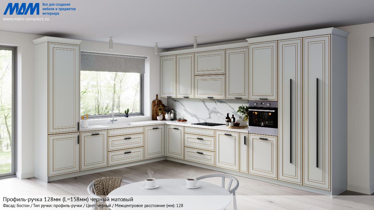 Мебельная Профиль-ручка 128мм (L=158мм) черный матовый на различных фасадах в кухонном интерьере в стиле классика, лофт, модерн.