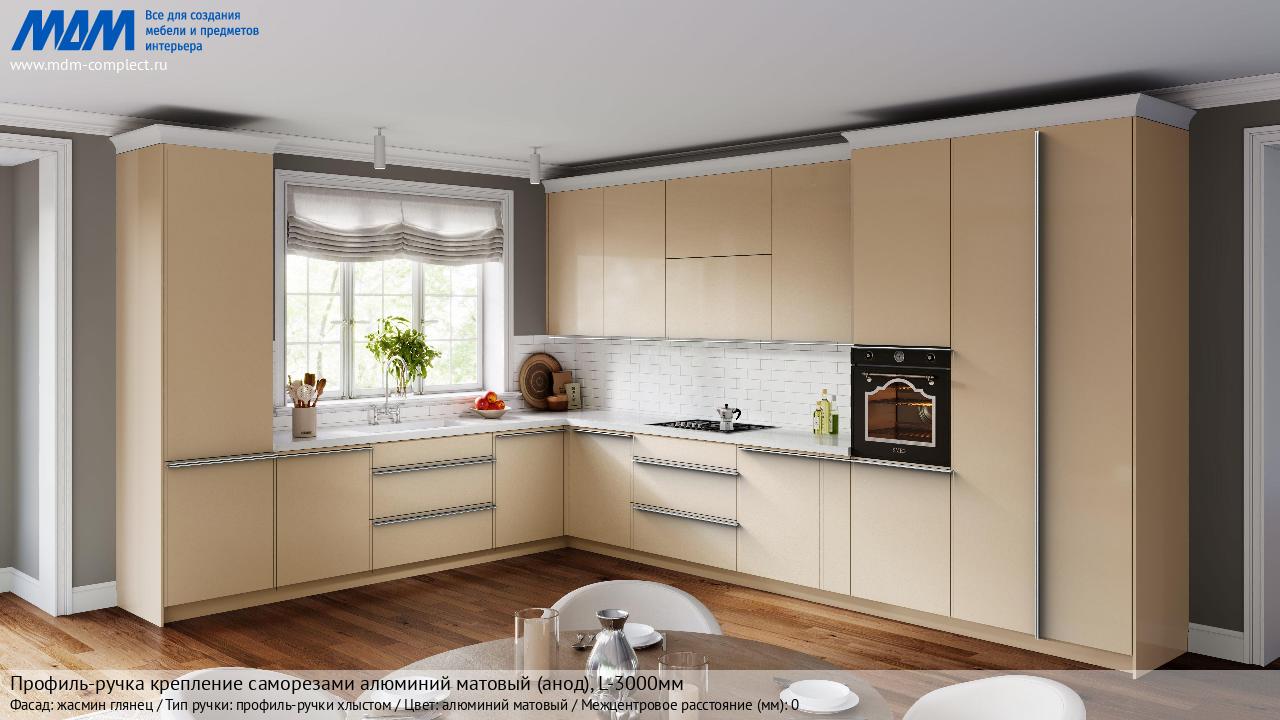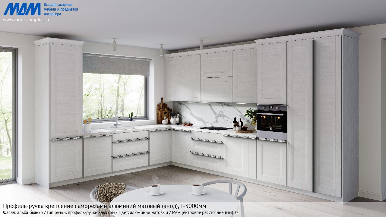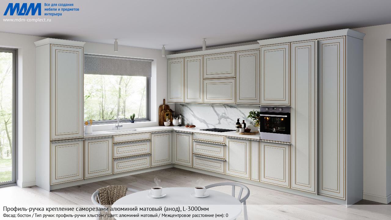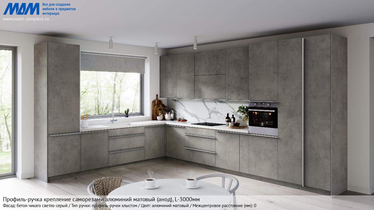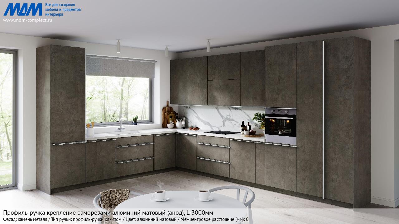 Мебельная Профиль-ручка крепление саморезами алюминий матовый (анод), L-3000мм на различных фасадах в кухонном интерьере в стиле классика, лофт, модерн.