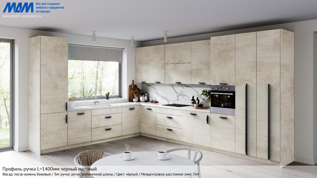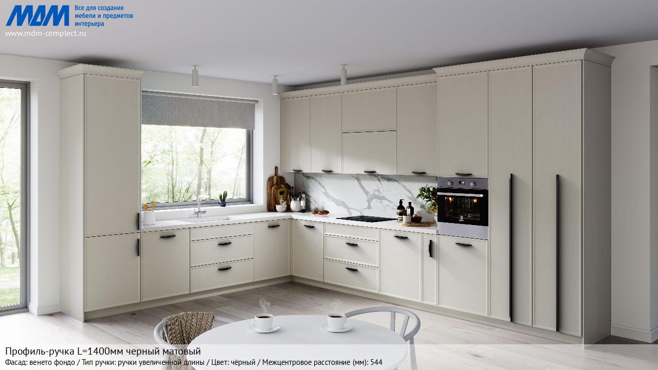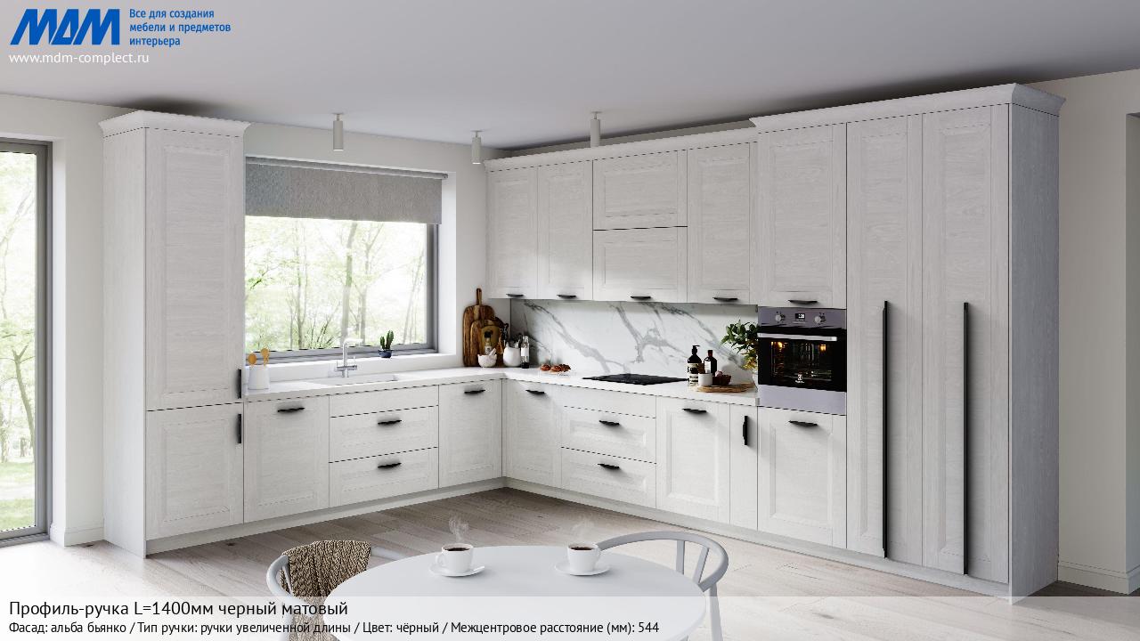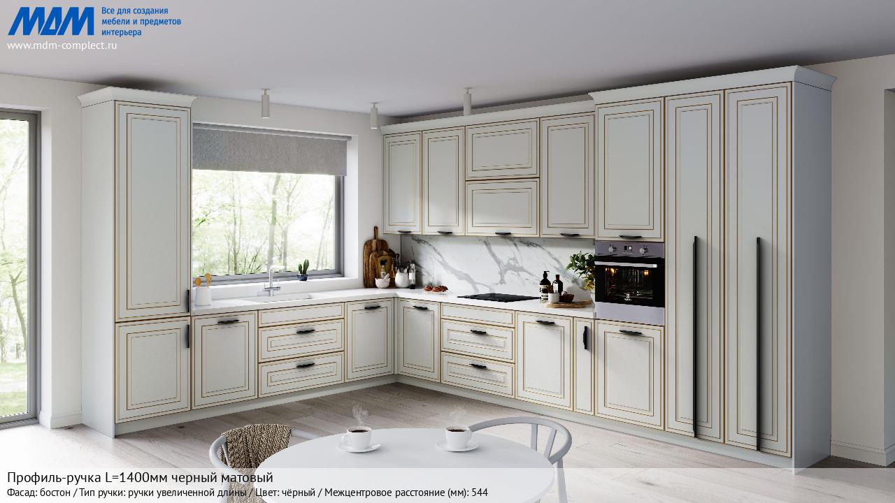 Мебельная Профиль-ручка L=1400мм черный матовый на различных фасадах в кухонном интерьере в стиле классика, лофт, модерн.