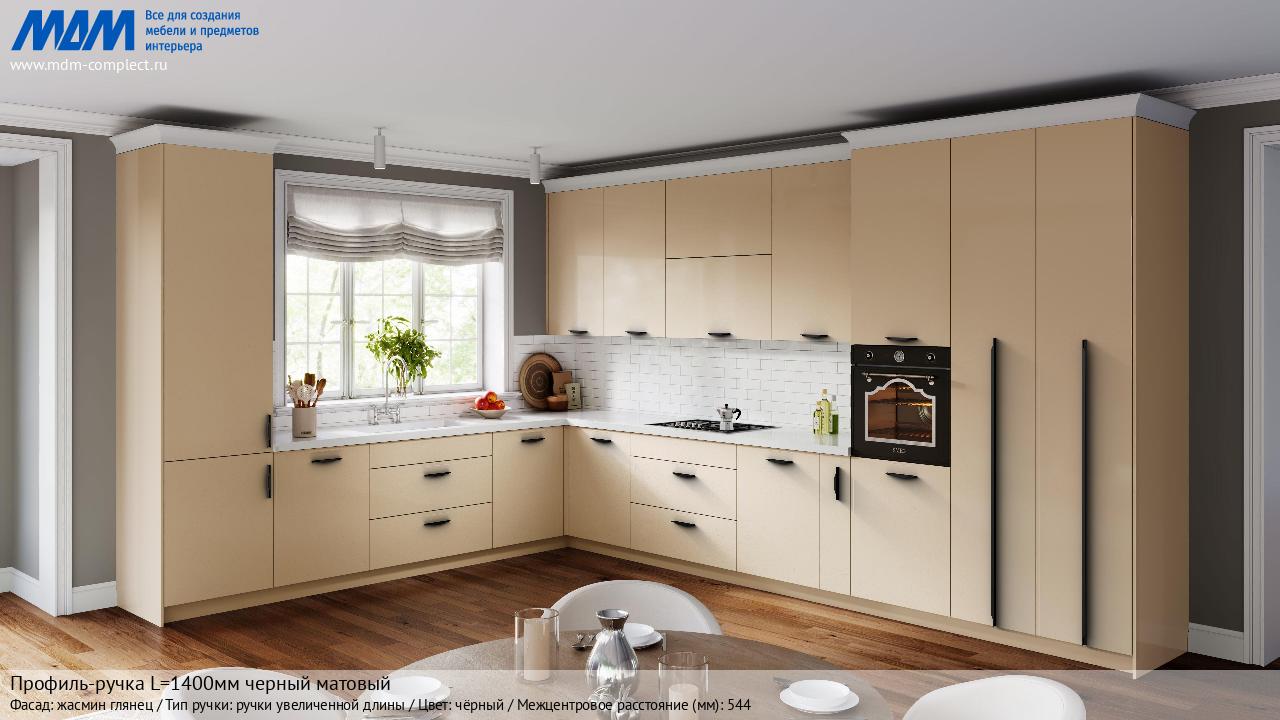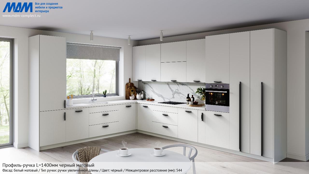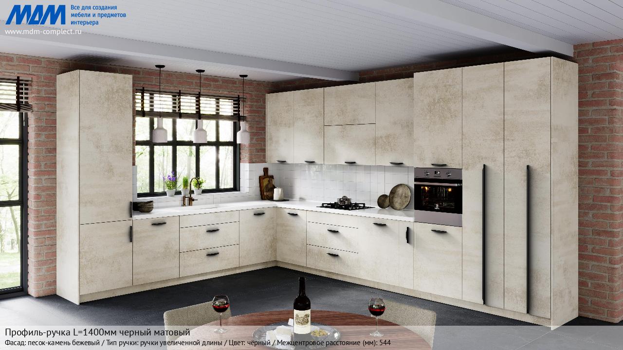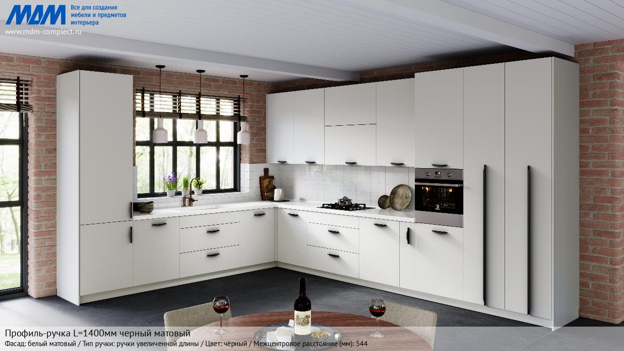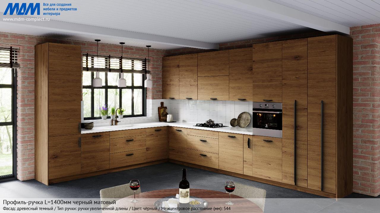 Мебельная Профиль-ручка L=1400мм черный матовый на различных фасадах в кухонном интерьере в стиле классика, лофт, модерн.
