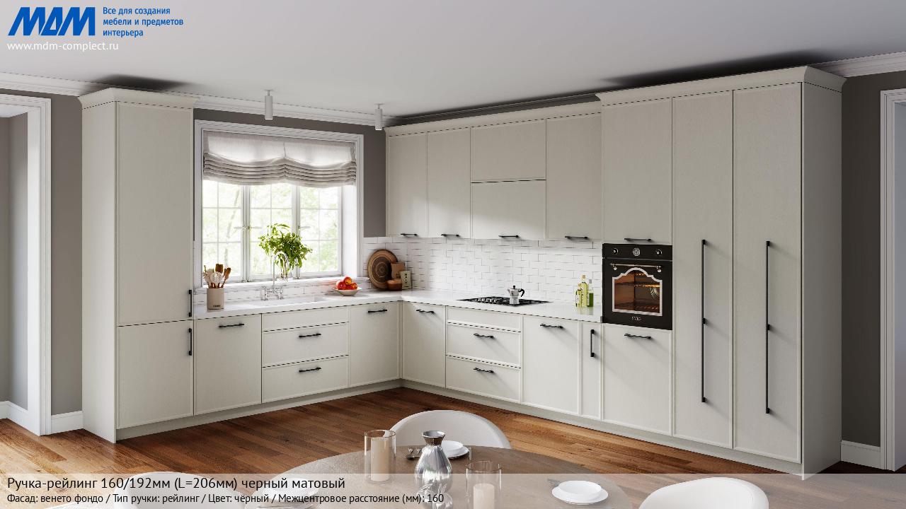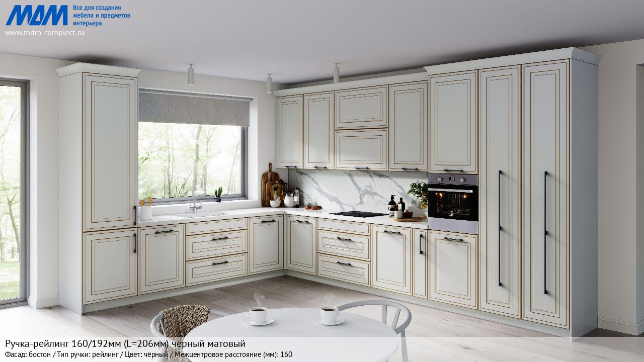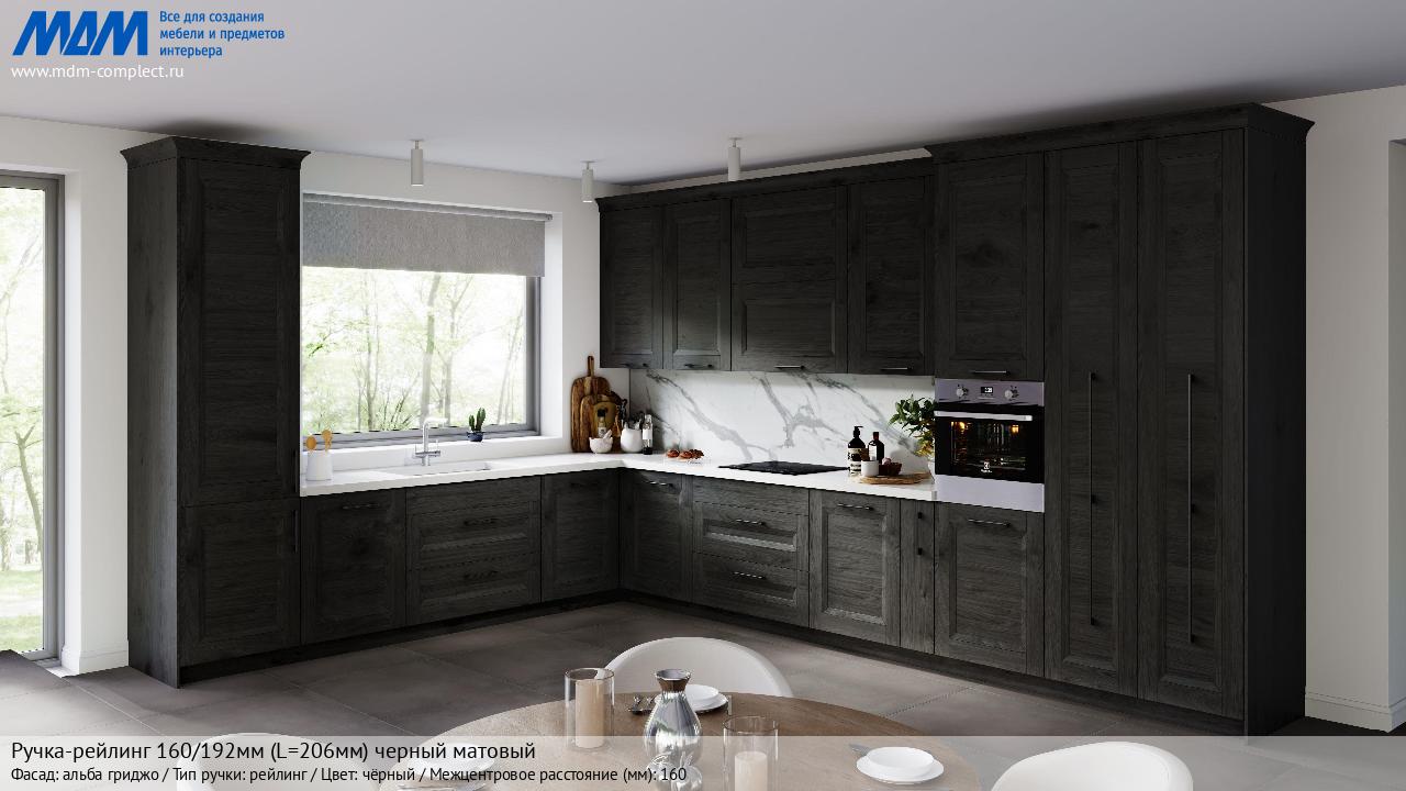 Мебельная Ручка-рейлинг 160/192мм (L=206мм) черный матовый на различных фасадах в кухонном интерьере в стиле классика, лофт, модерн.
